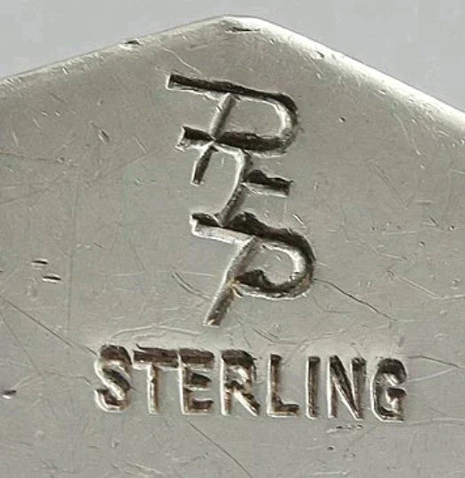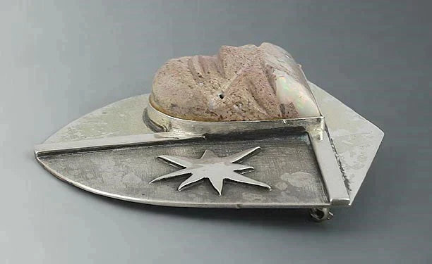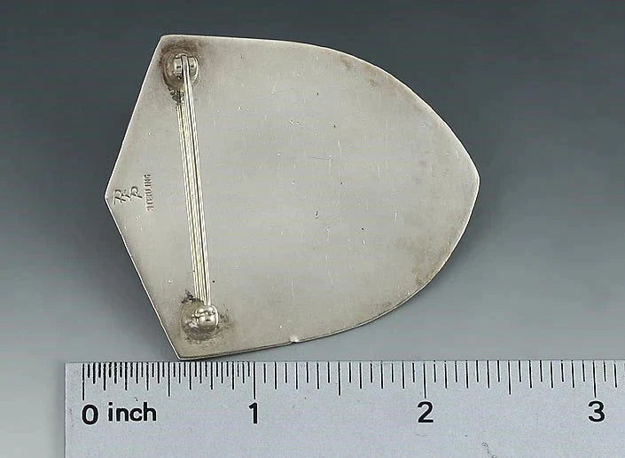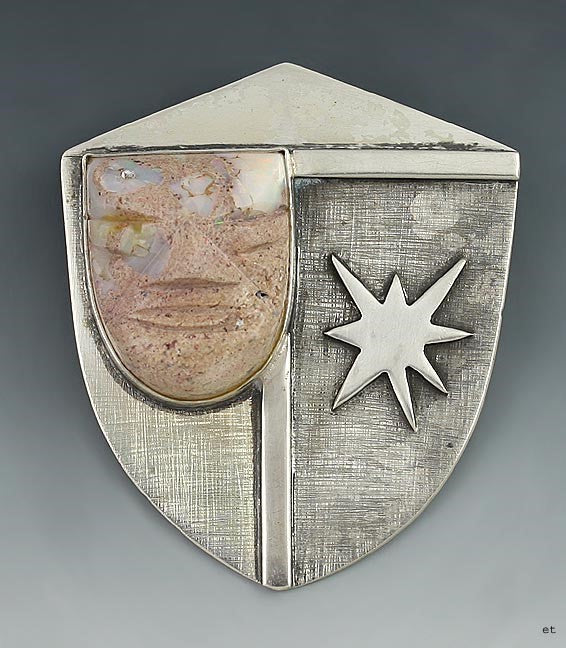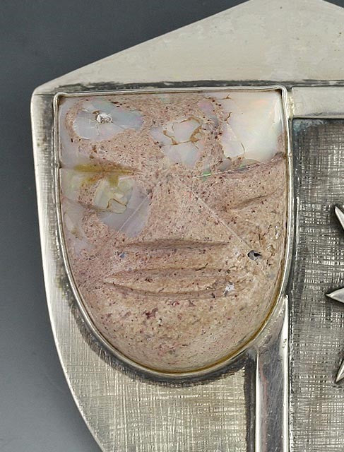 Offered in this sale is an unusual piece of American or possibly Mexican sterling silver in the form of a shield shaped brooch. The shield is divided into three sections: the left section is set with a Mayan or Olmec inspired mask carved of opal and opal matrix against a brushed ground, the right side of the shield has an irregularly formed star design against an oxidized brushed ground, and the top triangle has been left plain. While the overall style and especially the carved stone face give this the look of a Mexican piece, the maker's mark of PEP and the fact that it is simply stamped Sterling indicate that it is American in origin, probably from the 1960's or so.