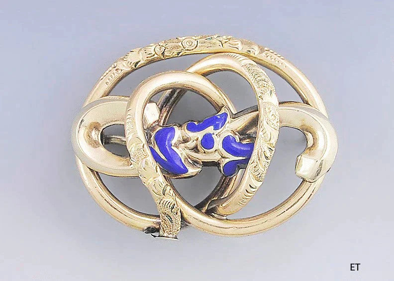 Presented is a beautiful Victorian 18 karat gold and blue enamel pin or pendant. This piece dates to the mid 1800s and is of American make. The pin is done in a swirled knot design, alternating a smooth finish with delicate hand engraved texturing and designs. The center of the pin has rich blue enamel in a design of ivy leaves. The back has an old C-style clasp as well as a loop/bail so it can be worn as a pendant.
