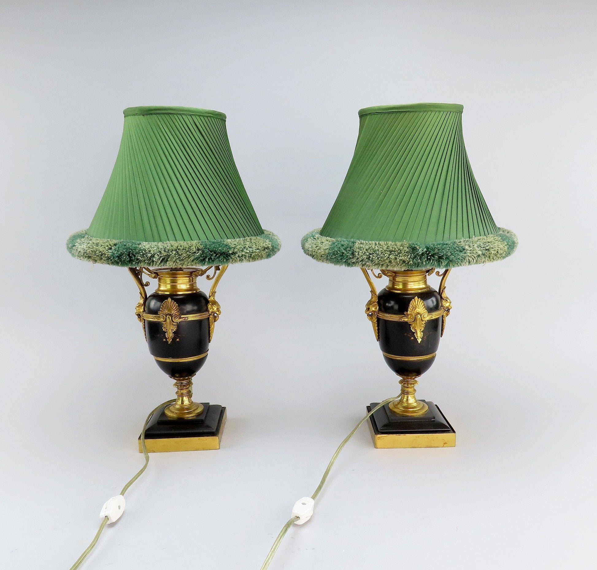 Presented is a beautiful pair of black stone lamps with gilt bronze mounts, likely from the mid-1800s. This pair is likely French, but could be English, and are onyx or slate urns that have been converted into lamps. They stand on a square base and display fancy tall handles with lion head masks and classical palmette and acanthus leaf decoration around the shoulders. This pair comes with the fabulous, well-made lampshades shown in the photos, which is how the lamps came to us. Let us know if you do not want the the lampshades and we will not ship them. The lamp cords are attached on the exterior of the lamps and held securely with fine metal wire. Both lamps are working.