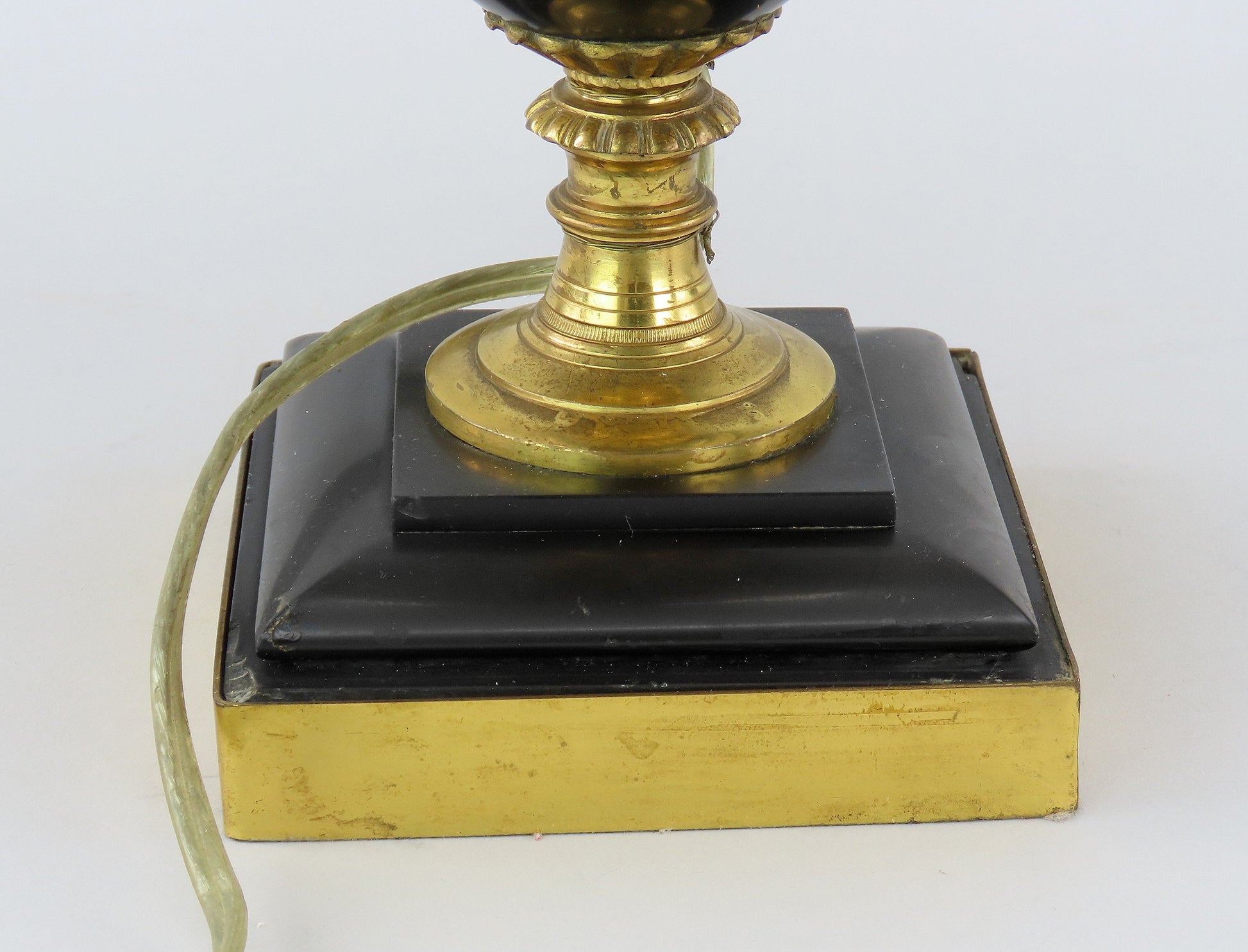 This pair is in great overall condition, especially considering age. On one lamp, the front decoration has some epoxy that we've added to secure it. This can only be seen in the side and is not visible from the front.
