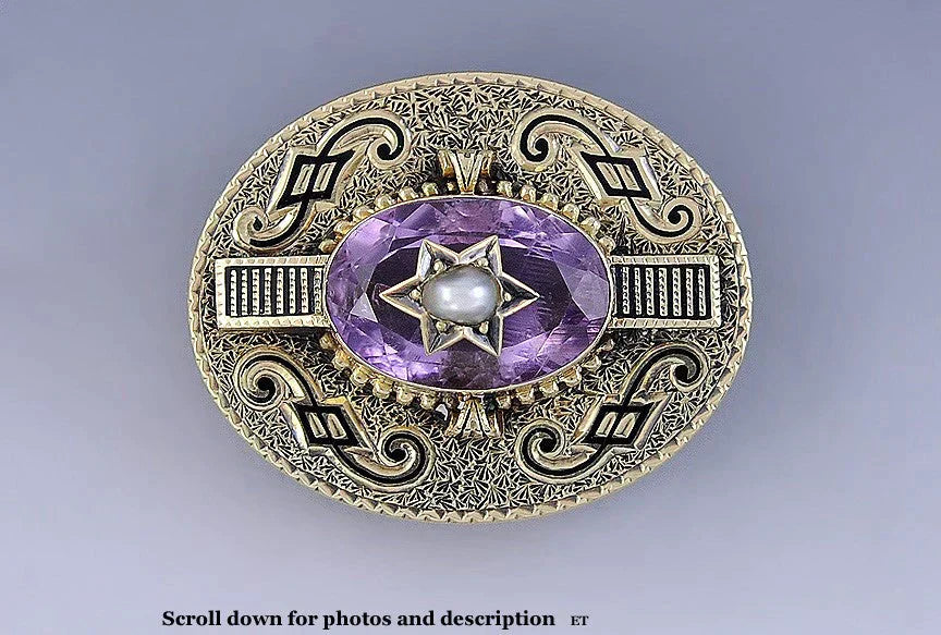 Mid 1800s Victorian Etruscan Revival 14k Amethyst Pearl Enamel Brooch/Pin