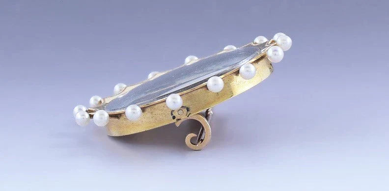 The pin is in great condition. The pearls are all securely set and in good shape. The portrait under the glass is in great shape, and the glass has no chips, no cracks, and no breaks. The clasp functions well and closes securely, with a good strong spring mechanism.