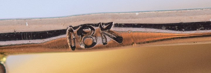 The pin is stamped and guaranteed 18k, on the shaft. We have tested the pin with nitric acid and guarantee it to be 18 karat gold.