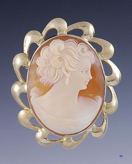 Presented is a vintage, 14 karat yellow gold and natural shell cameo brooch or pin made during the middle of the 20th century, certainly the 1950s. The cameo is finely carved into the profile of a pretty woman’s face. The cameo is secure around the thick gold bezel and the outer border is done in an openwork form. Every other wave design along the bezel has a nice florentine finish, which looks good contrasting against the highly polished waves. The back of the pin has a loop to hang the piece as a pendant if so desired. The clasp has a safety latch for added security.