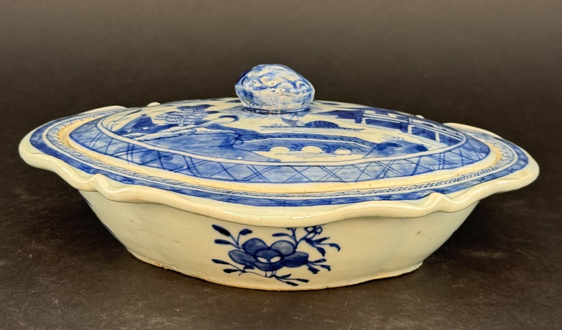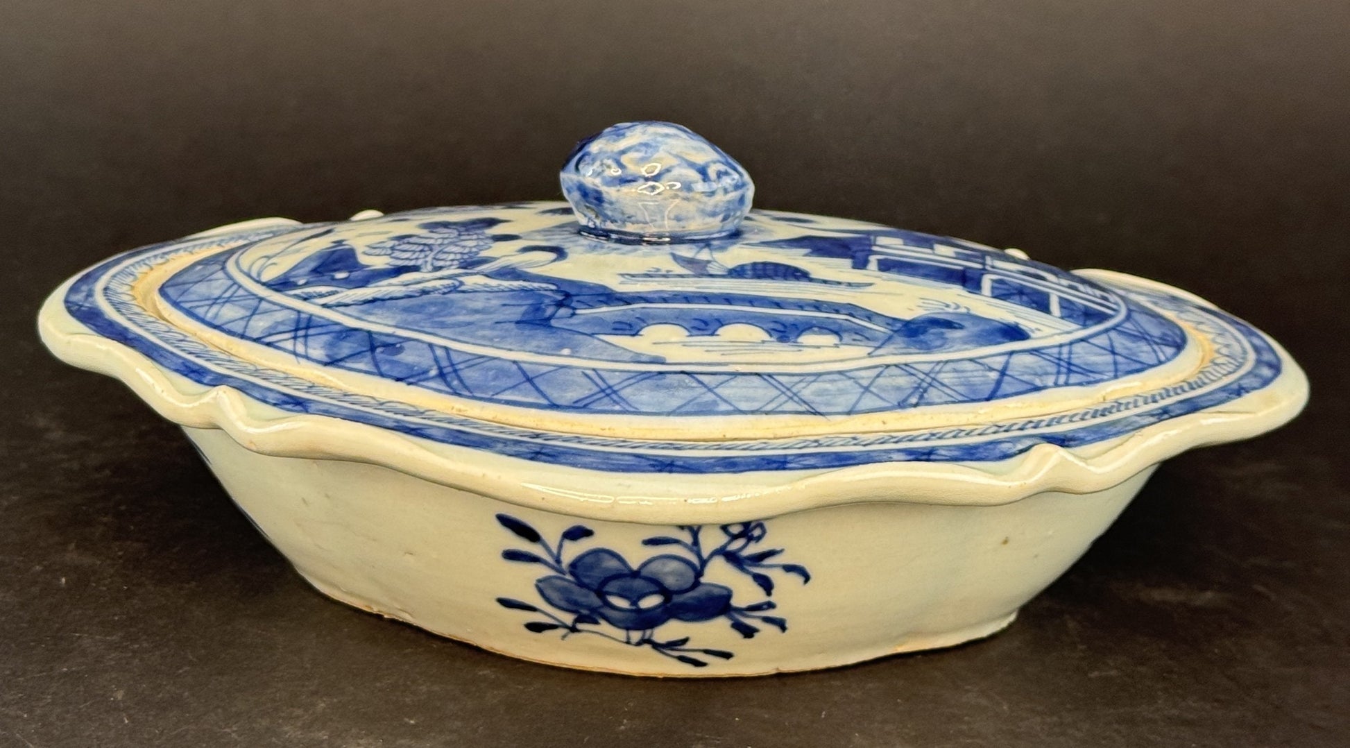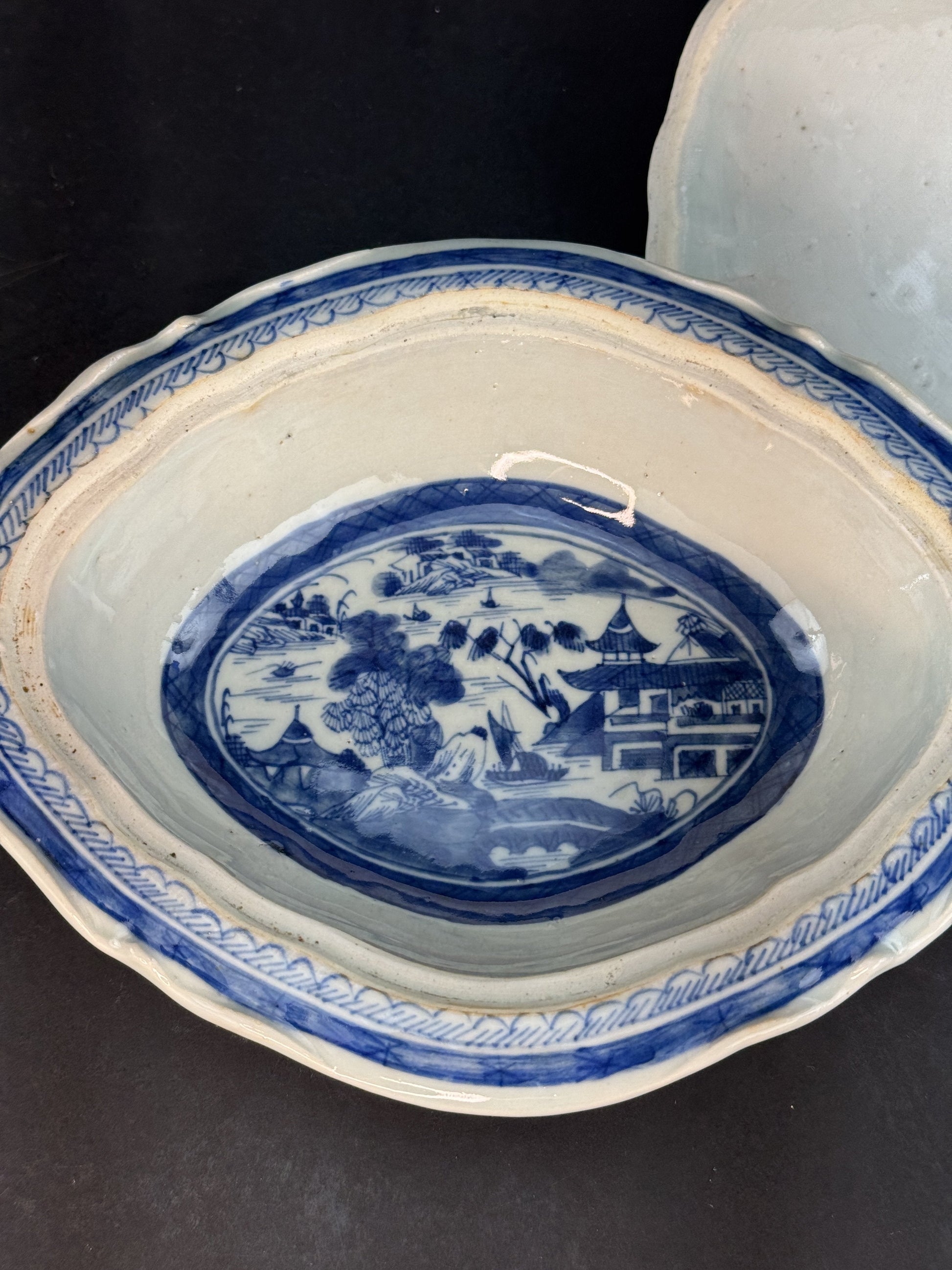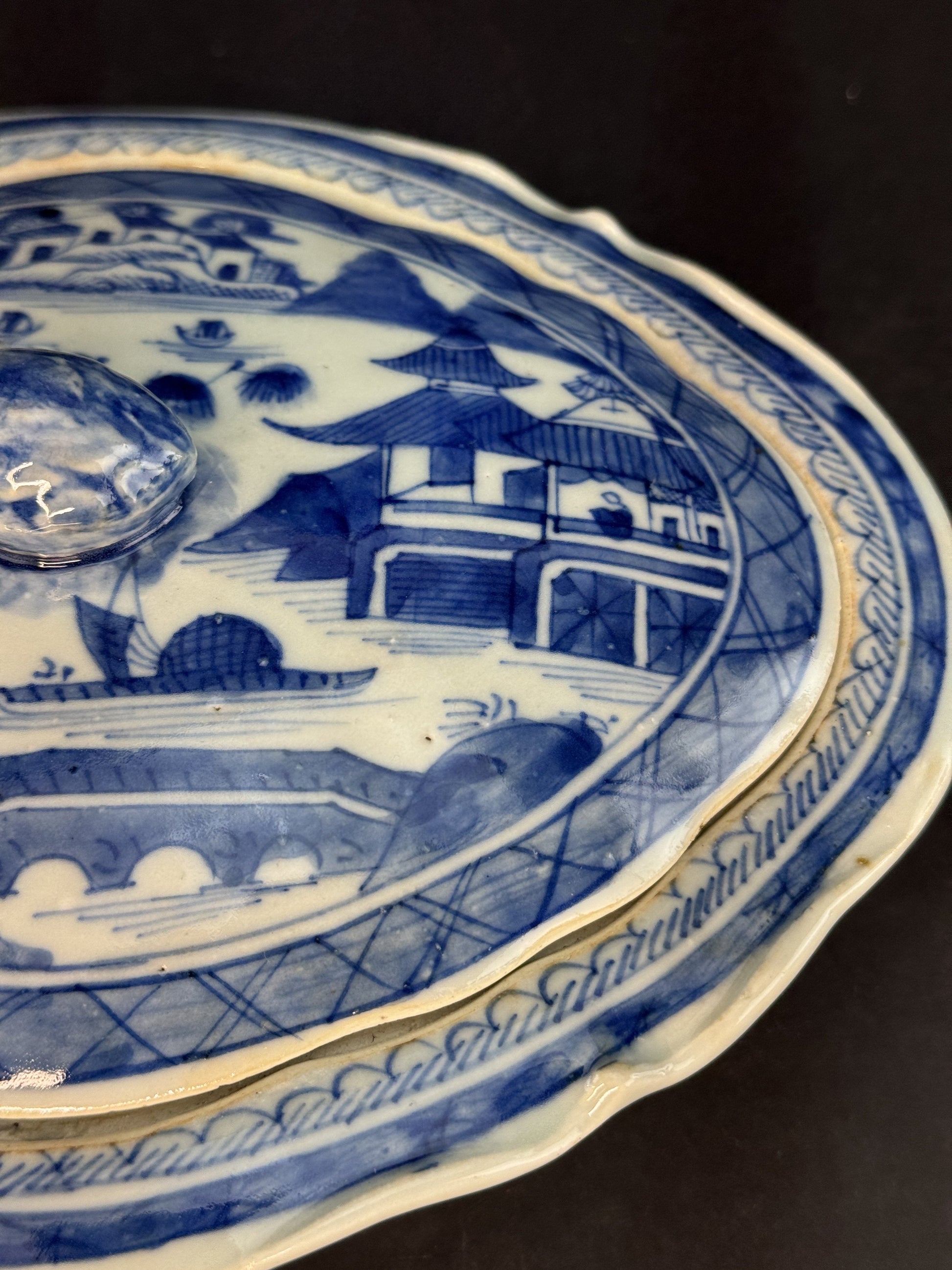 Mid/Late 1800s Chinese Export Blue White Canton Blue Willow Covered Serving Dish