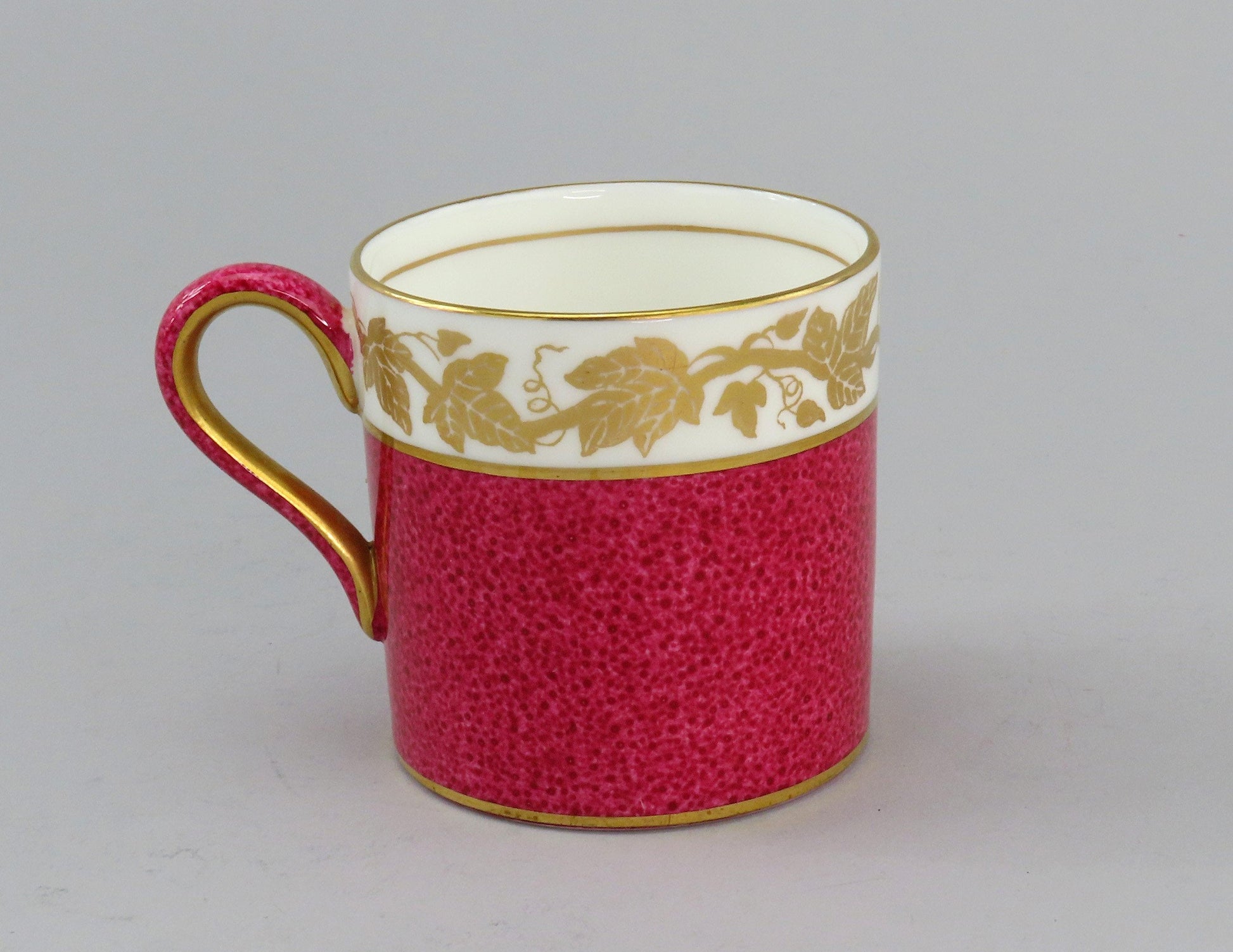 Presented is a nice mixed set of bone china pieces from Wedgwood. This group is in the Whitehall pattern, which was produced between 1945-1987. The pattern displays gilded grape clusters and leaves in a border. This version of Whitehall has a powder ruby band as part of the border as well. The mixed set includes a demitasse cup, a footed cream soup bowl, and an oval underplate likely for a gravy boat.