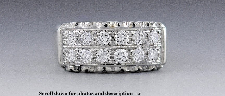 Presented is a fine 18 karat white gold ring set with two rows of six modern brilliant-cut diamonds. Each of the 12 diamonds is about 5pts, for a total diamond weight of about 60pts, over half a carat. The diamonds are of VS quality, maybe VVS on some, and of G color. The white gold setting is beautiful high quality work, with a cross-hatched finish on either shank. We are unsure whether this is an American or European piece, but in any case it's gorgeous.