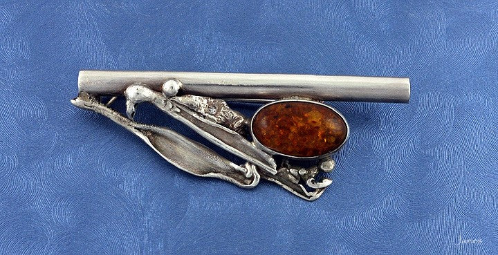 Modern Sterling Silver Polish Genuine Amber Pin Brooch