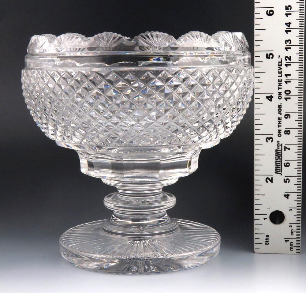 Presented is a beautiful, cut glass compote, pedestal bowl or dish made by Waterford in the past 30 years. This is a very fine quality and heavy weight piece. The body is cut in a lovely diamond pattern and the rim has shell form decorations. The underside of the base has a sun-ray design.