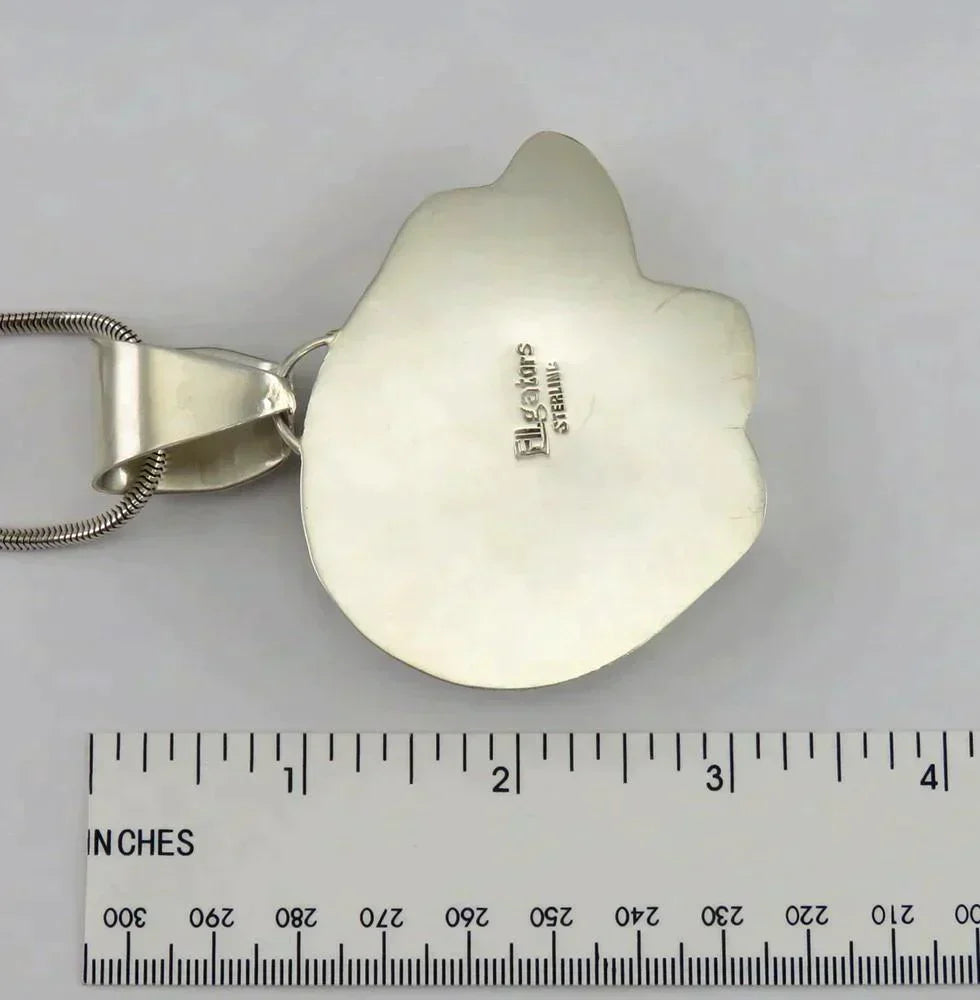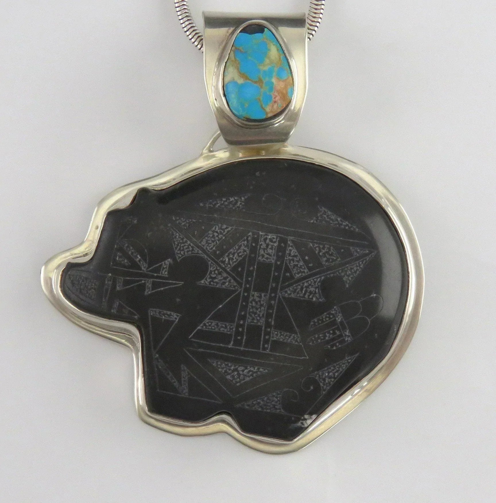 Presented is a completely hand crafted, sterling silver, obsidian and turquoise pendant with chain. This piece is Native American Indian in origin and the back is signed by the artisan: Ell. Gators. The huge pendant is securely set with a bear shaped obsidian stone that is engraved with design. The bale is set with a turquoise stone and is large so a thicker chain could be used. The chain is sterling silver purity as well.