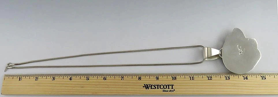 The pendant itself measures 3 by 2 7/8 inches and the chain measures 24 inches long.