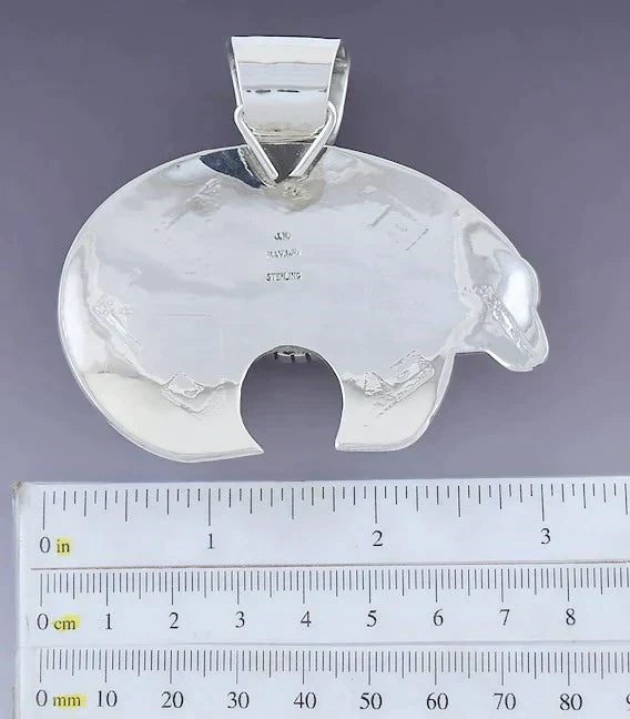 Presented is a beautifully handmade, sterling silver pendant made by a member of the Navajo Tribe. This Native American piece is very large and heavy. The quality of the silver work is better than most. The pendant is in the form of a bear and the center is securely set with a large turquoise stone. The bale is very large as well.