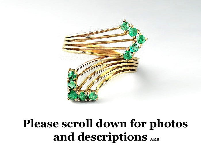 The ring features a strand-like design to the gold with small emeralds gracing each gold strand.