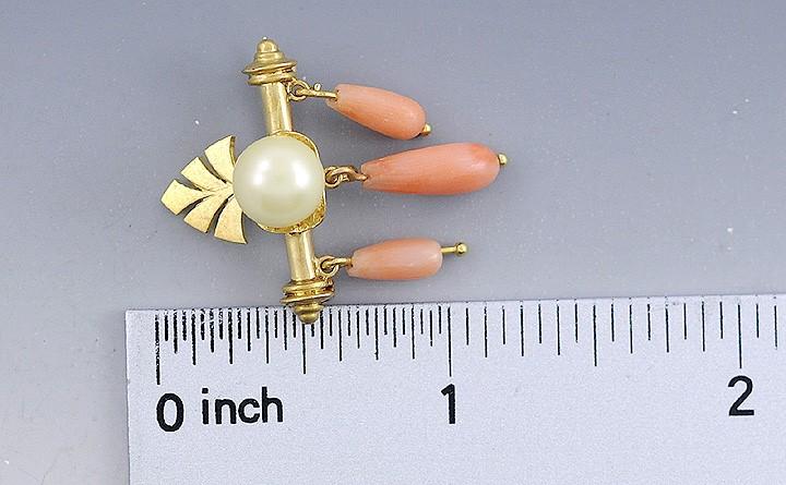 Presented is a neat Victorian coral and pearl 14K gold pin. A stylized palm frond arcs over a gold bar set with a large pearl. Three coral drops dangle beneath the bar. The pearl is a later replacement of a flat stone, and it is very likely a cultured pearl. The piece was made between the 1860s and 1880s, and it was likely made in America.