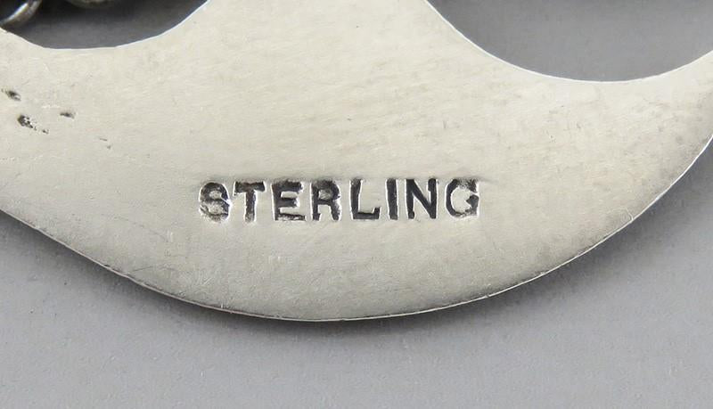 Presented is a wonderful antique American sterling silver stickpin. This piece dates to the late 1800s or very early 1900s. The pin is made in the form of an ornate battle axe or halberd, with finely engraved foliate scrollwork on the blade. The shaft of the stickpin makes up the handle of the axe, and the stickpin has an attached stopper/cap at the bottom, on a fine silver chain so it can't be lost.