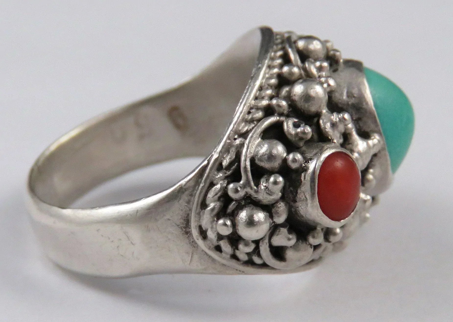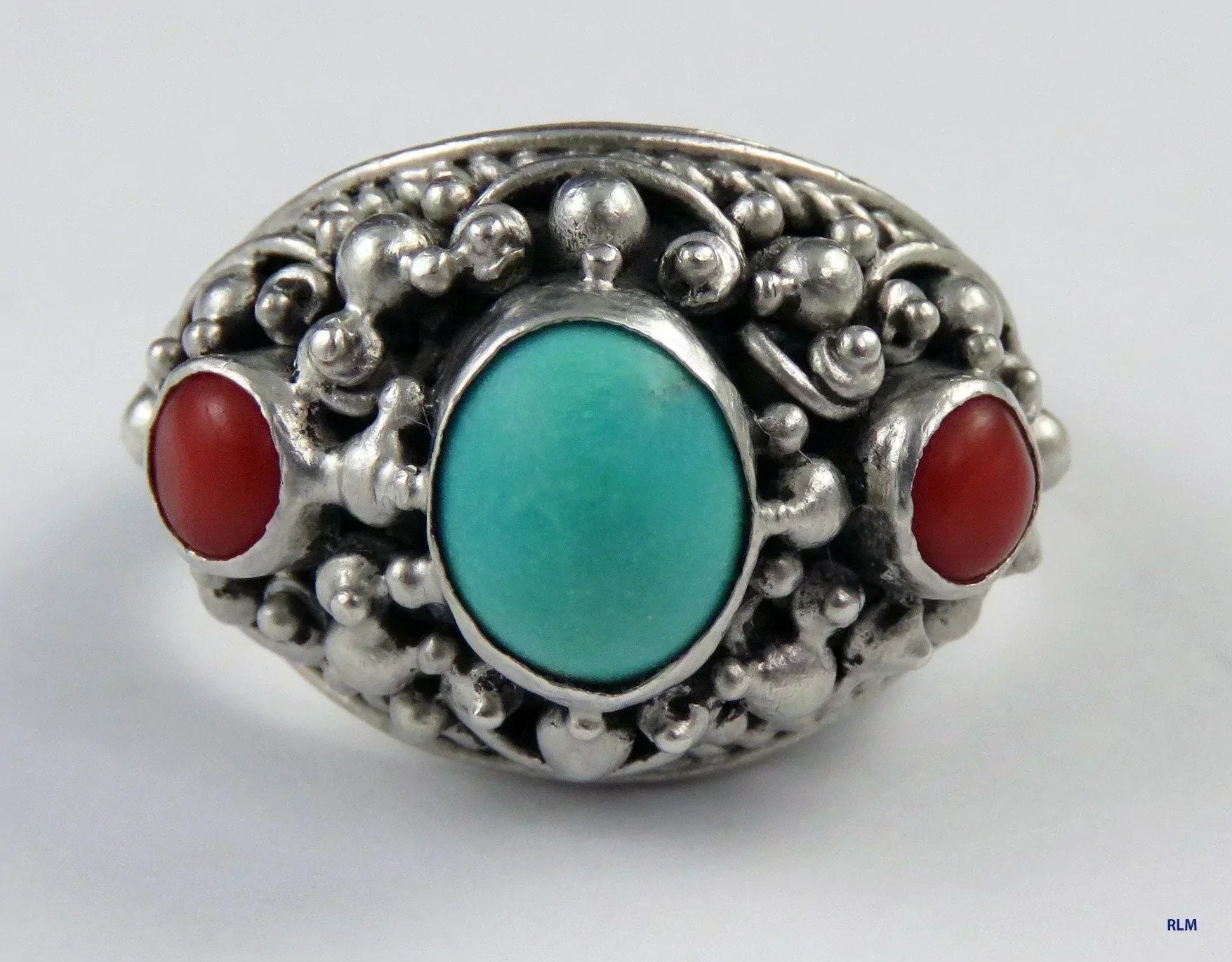 Presented is a wonderful, silver, turquoise and coral ring made in Bali. The domed top is decorated with applied silver beads and wire. The top is bezel set with two coral beads and a turquoise cabochon. This ring is a size 8 and could be resized by a jeweler if need be.