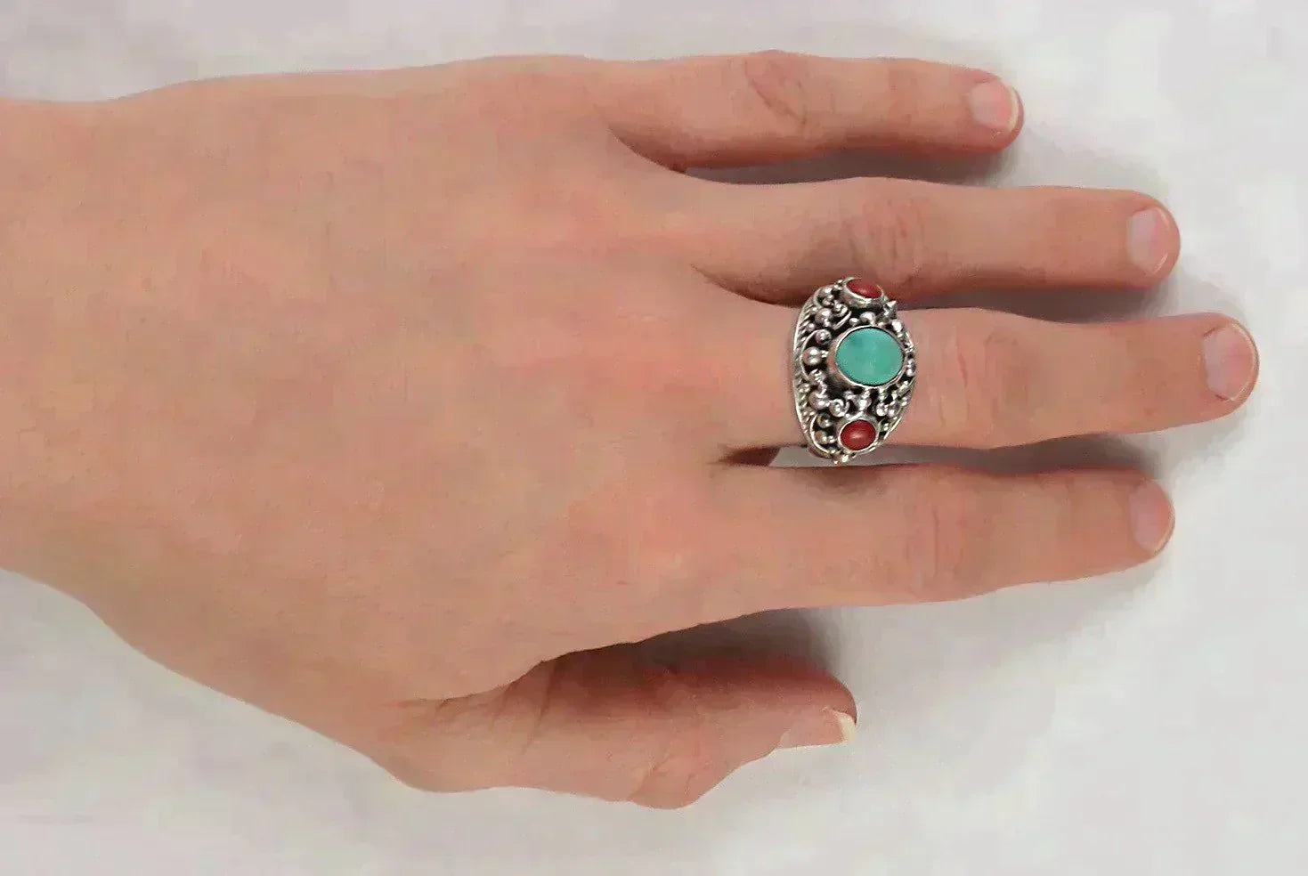 Neat Bali Silver Coral & Turquoise Stone Statement Dome Ring