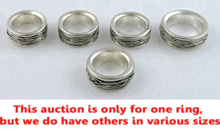 Presented is a hand crafted sterling silver ring with individual sterling silver wires wrapped around the band. This ring cannot be easily sized because of all the applied wire decoration, but we have the ring in several different sizes. Tell us which size you want and that is the size we will send you. We have sizes 4 ¾, 5, 6. This auction is for only one ring.