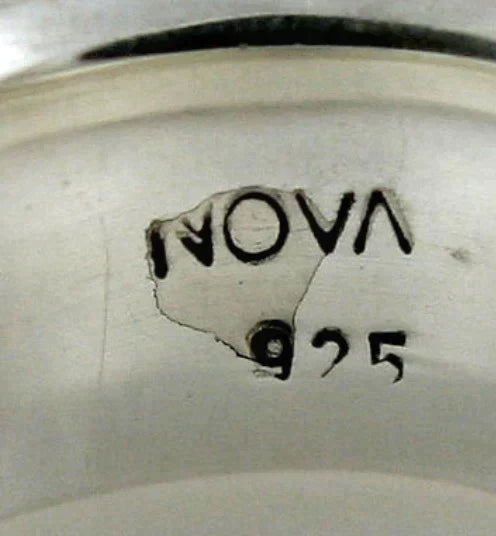 The ring is marked on the inside of the band with Nova and 925. We have tested it with nitric acid and guarantee it to be sterling silver. The condition is excellent. There are no dents, no dings, no splits, no breaks, and no repairs.