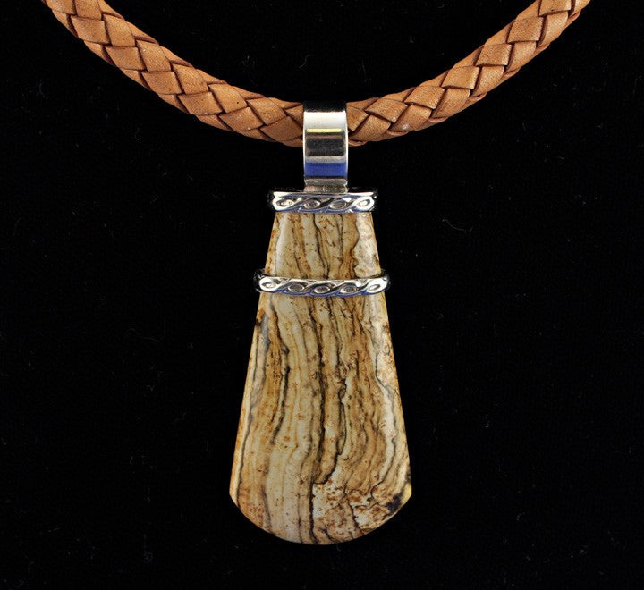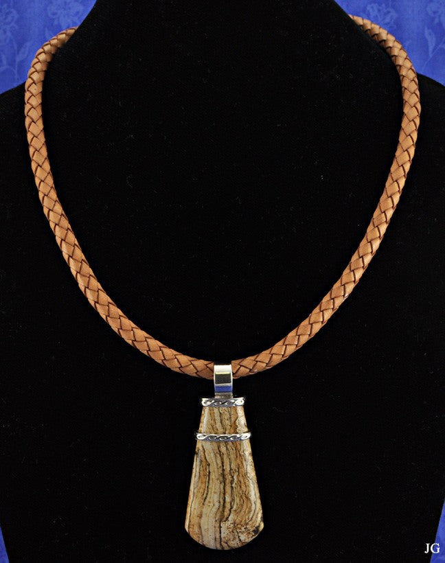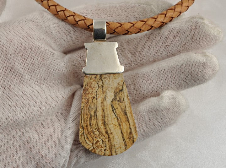 This necklace features a large brown genuine agate stone pendant on a woven leather cord