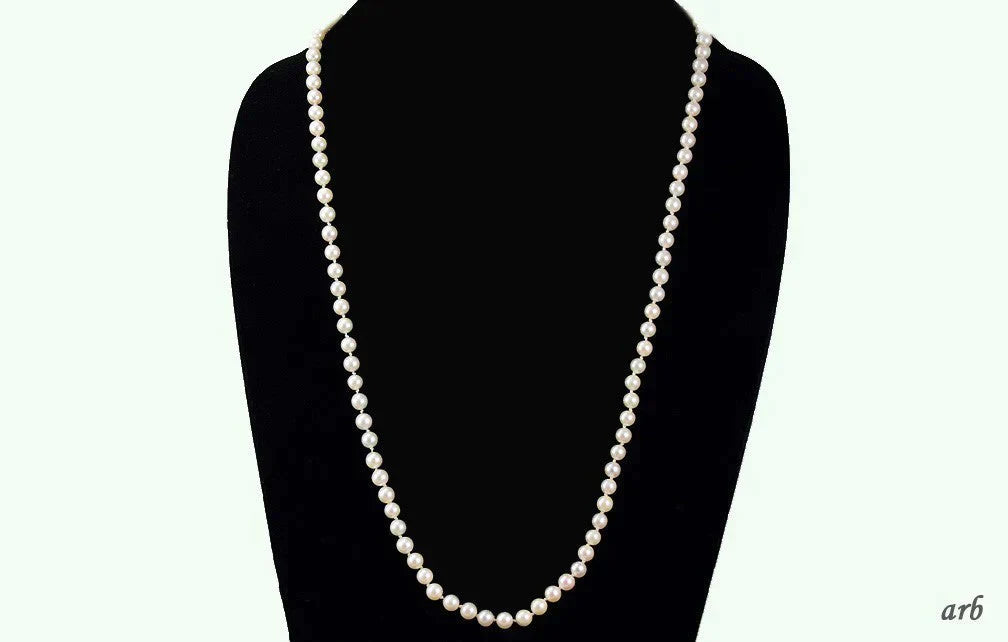 Presented is a gorgeous long necklace of sparkling white pearls.
