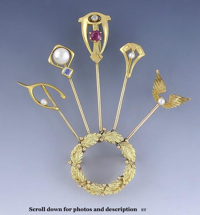 Each of the five stick pins is stamped and guaranteed 14 karat gold purity.