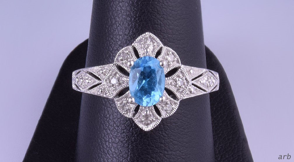 Nice ADL 10k White Gold Ring Set w/ Blue Topaz and 8 Accent Diamonds Size 8.5