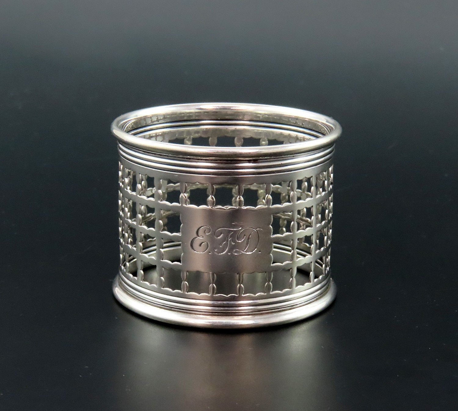 Presented is a fine quality antique Gorham sterling silver napkin ring. The ring is made in a lovely openwork form, with a design like a rope net. One side has a solid cartouche with a monogram of EFD in flowing script.