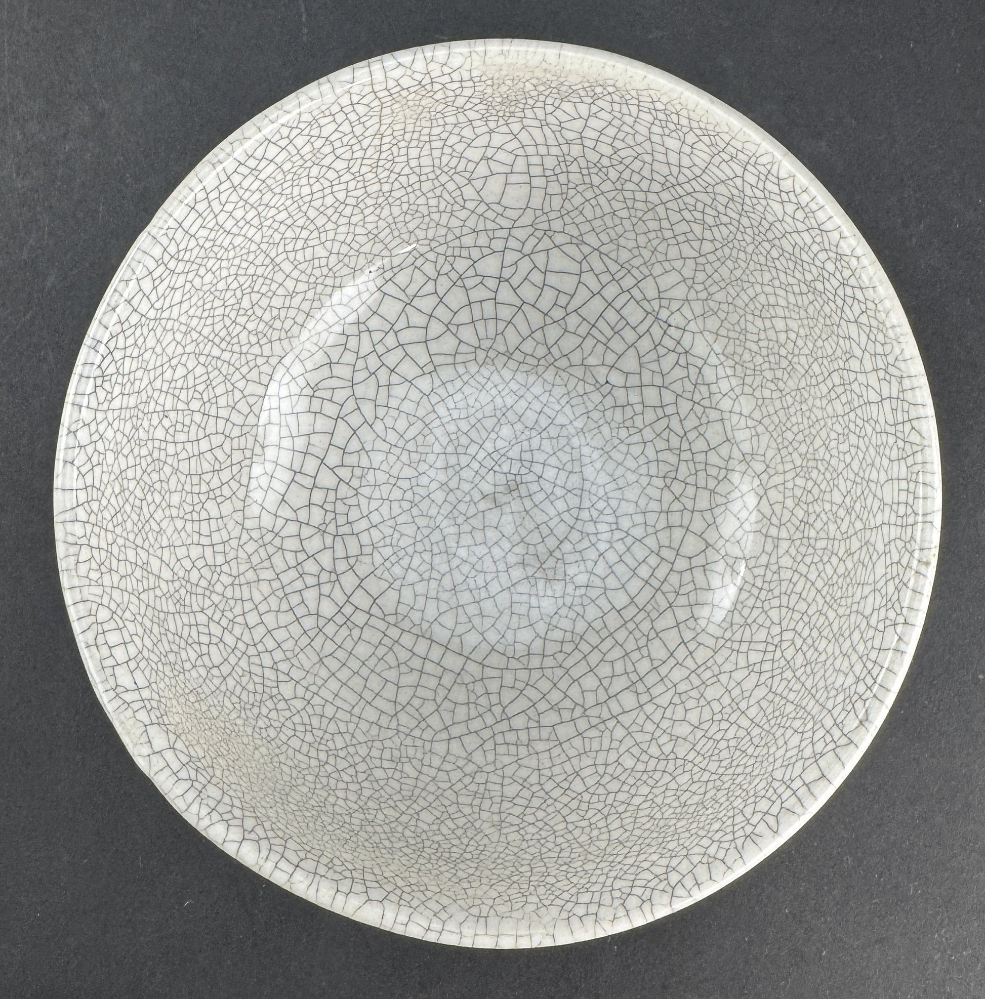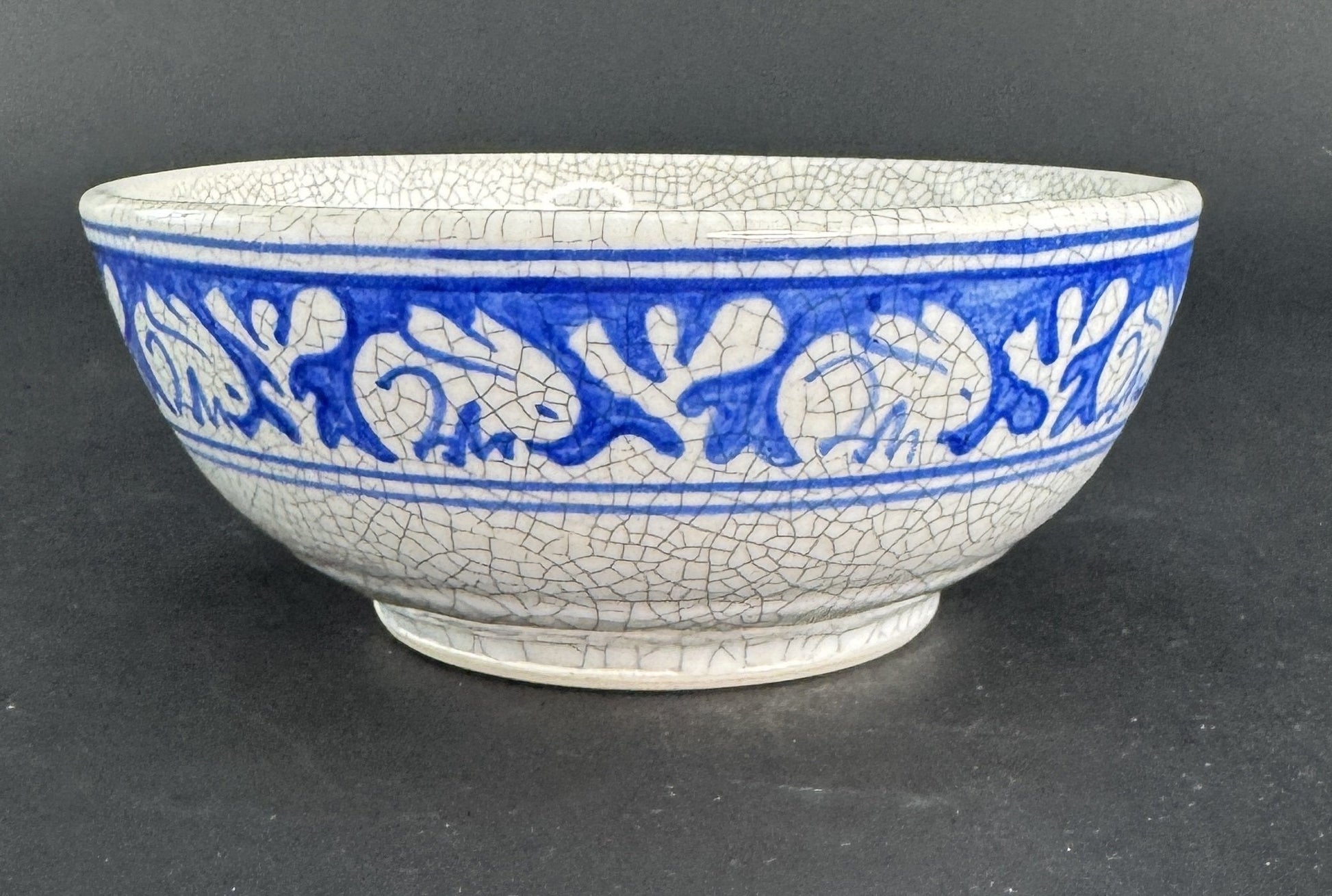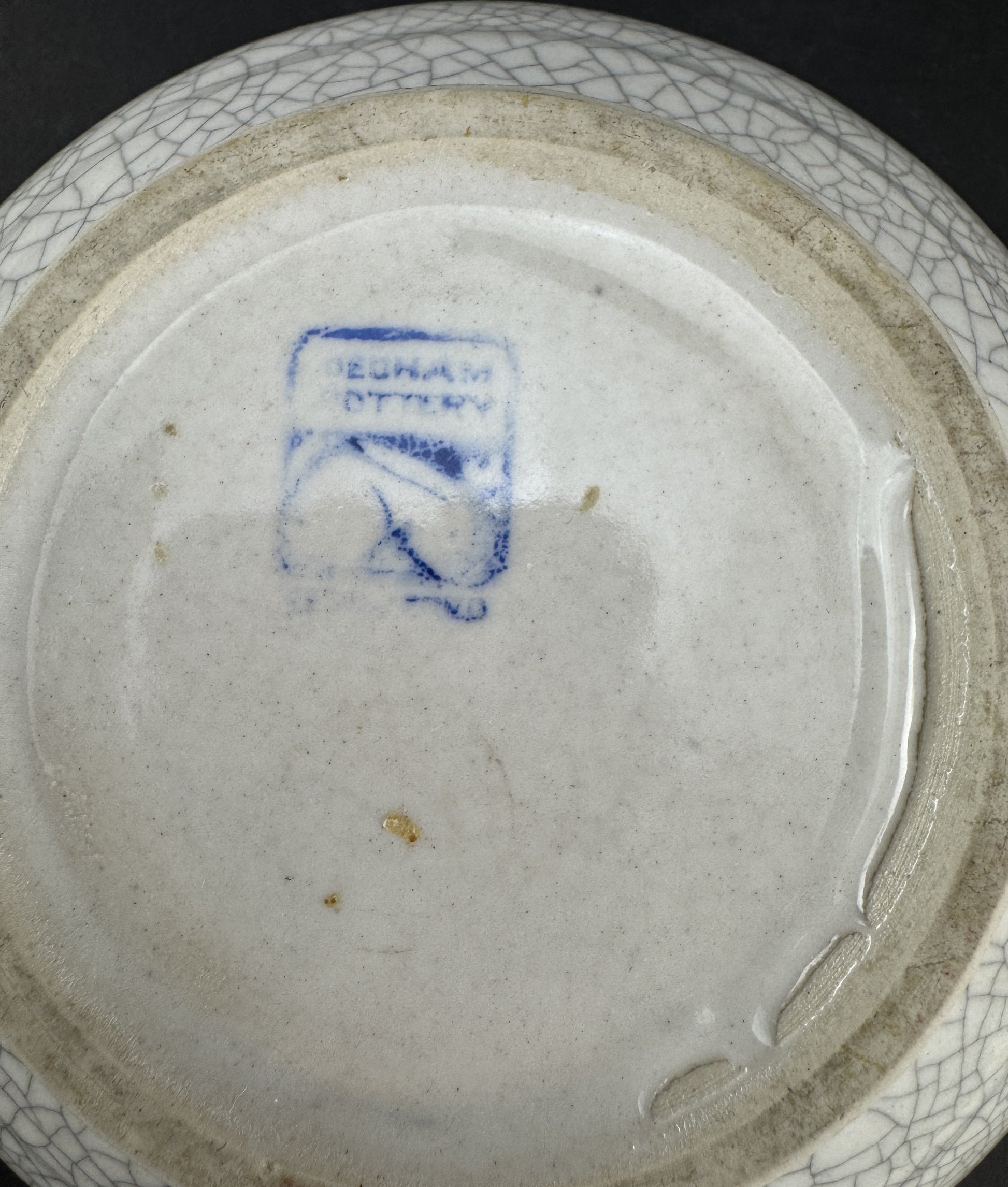 This piece is in good overall condition. There is an invisible crack/hairline to the bowl, which is discernible by how it rings (or doesn't) when tapped, but is not something I can find visually amidst the normal lines of the crackle glaze. There is no discoloration, and there are no chips, no breaks, and no repairs.