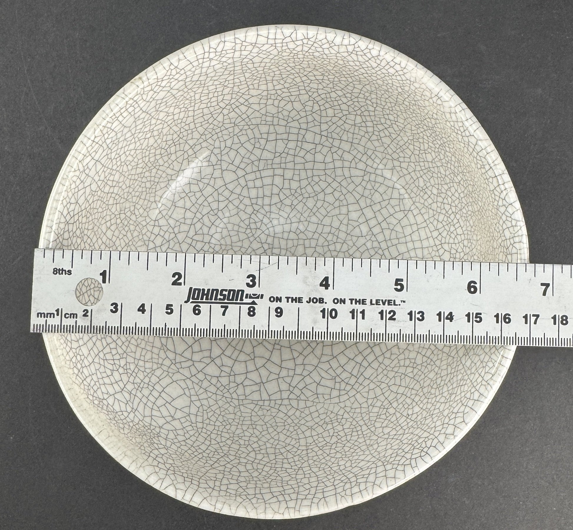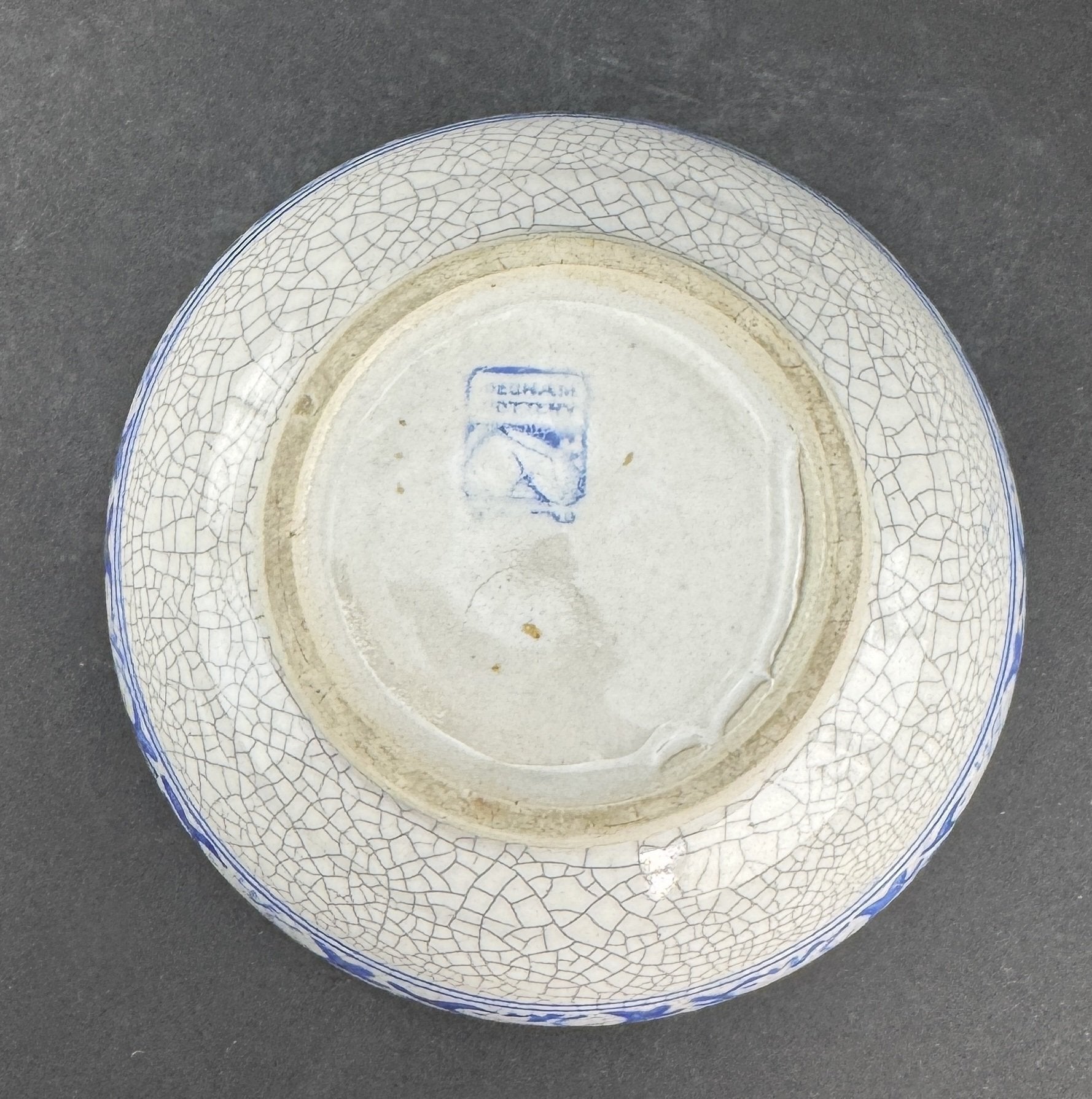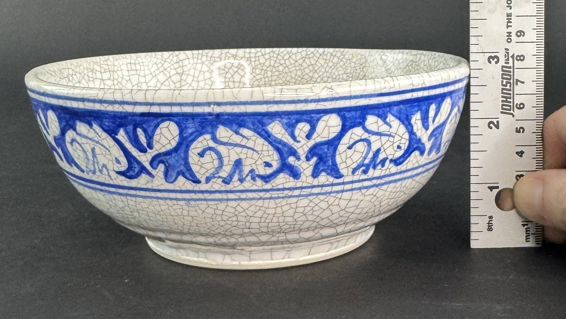 This piece is in good overall condition. There is an invisible crack/hairline to the bowl, which is discernible by how it rings (or doesn't) when tapped, but is not something I can find visually amidst the normal lines of the crackle glaze. There is no discoloration, and there are no chips, no breaks, and no repairs.