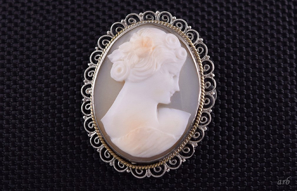 Nice Antique Silver and Carved Shell Cameo Filigree Pin of Woman