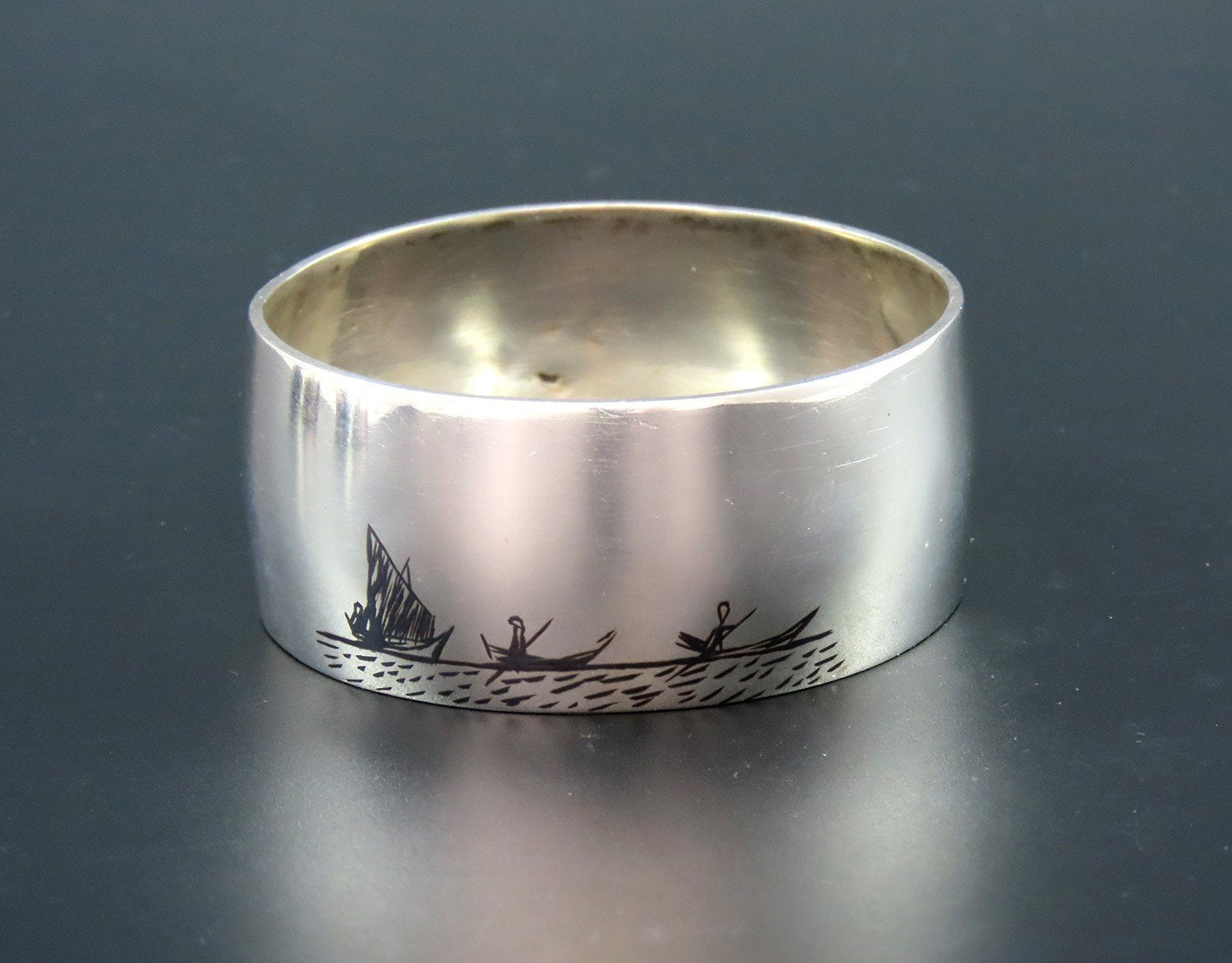 Presented is a nice Middle Eastern engraved silver napkin ring. This piece displays two enamel decorated scenes; one with three boats and the other with stylized animals. Between the scenes, the ring is engraved “Ray”.