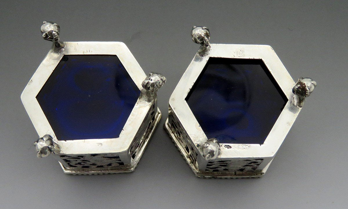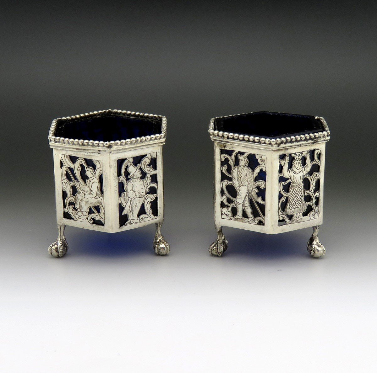 Presented is a delightful pair of antique Dutch silver and glass salt cellars, dating to the first half of the 1800s. These salts are made in a hexagonal form, with openwork decoration and engraved genre scene figures on the sides. The little peasant figures are nicely detailed considering the scale, and the glass liners, done in rich blue cobalt glass, show through the openwork in a very appealing way. The salts stand on three ball and claw form feet, and have a beaded border around the upper edge.