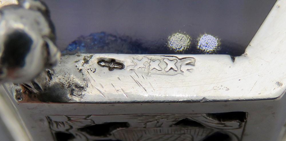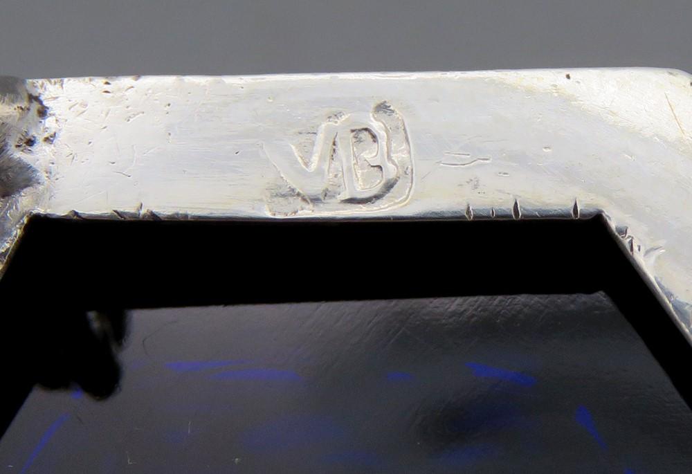 One salt is stamped with the Dutch small article mark guaranteeing at least .833 purity silver, as well as a city mark for Amsterdam and a maker's mark of VB. The other salt undoubtedly had the same marks, but they are mostly worn, with only some of the Amsterdam and VB marks visible.
