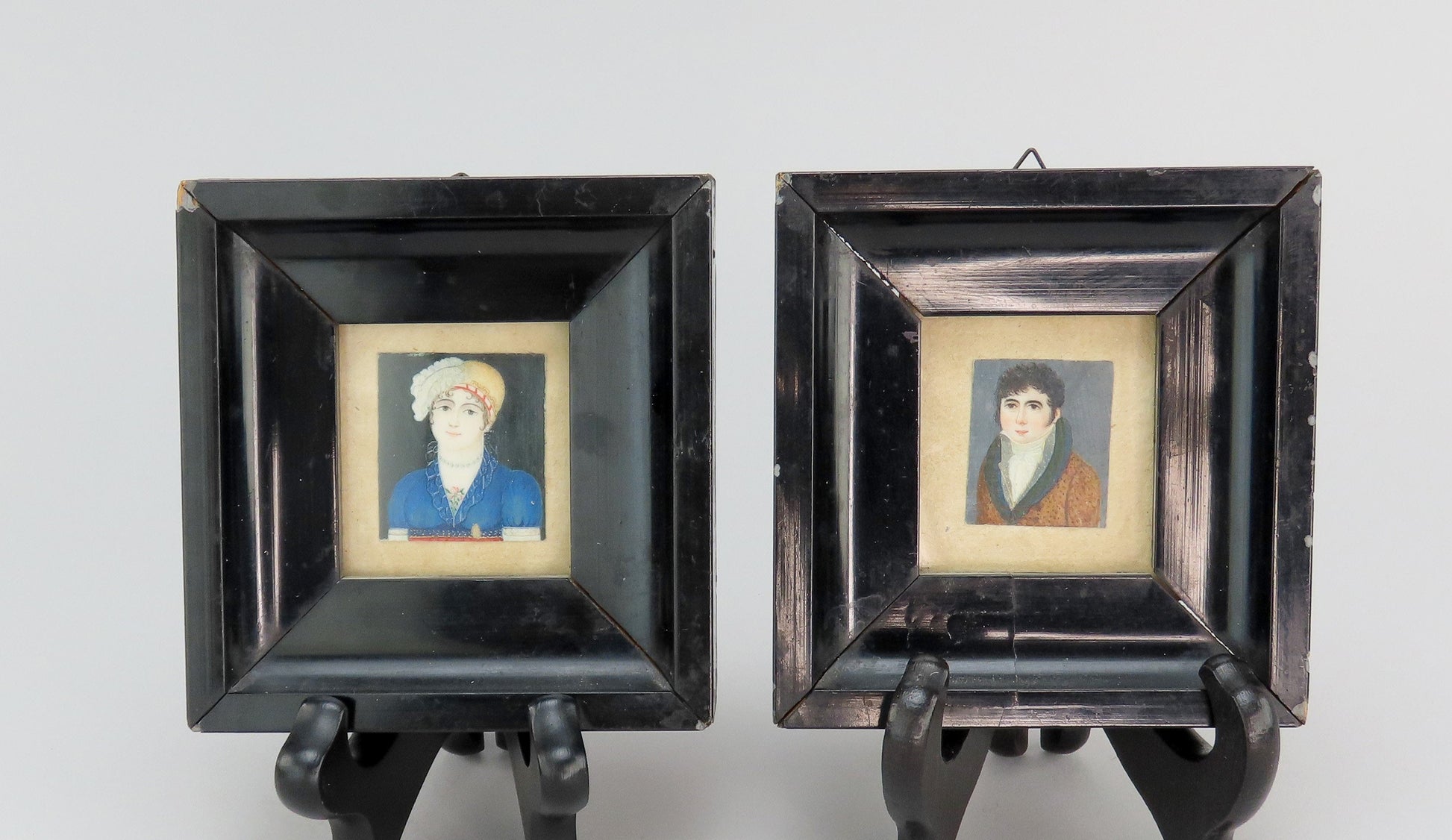 Nice Pair Early 1800s English Handpainted Miniature Portrait Paintings Man Woman