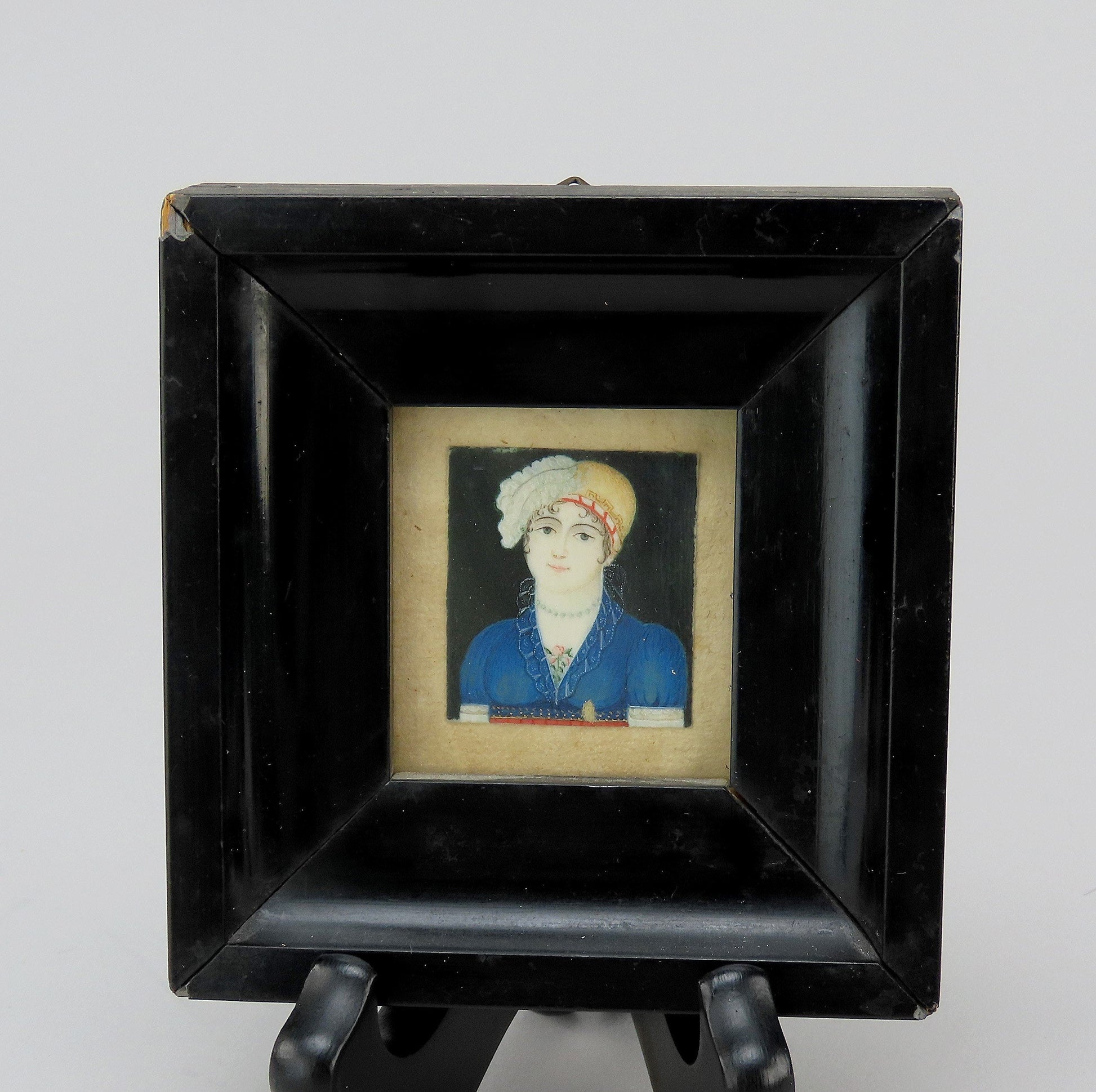 Presented is a wonderful quality pair of antique miniature portraits in black veneer wooden frames. The portraits date to the first quarter of the 1800s and are likely English. Both portraits are fabulously hand painted, one depicting a woman in blue with a feathered hat and the other depicting a man with a ruffled cravat and brown coat. The portraits have been mounted on paper and are set in wide black frames, with loops on the back for hanging.