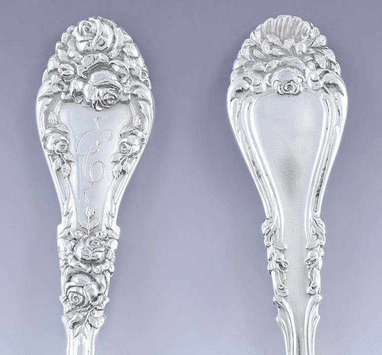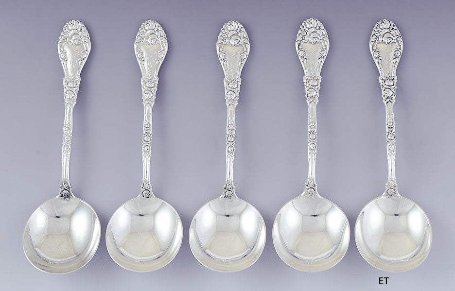 Nice set 5 Durgin Sterling Silver Marechal Niel Large Gumbo Soup Spoons C Mono