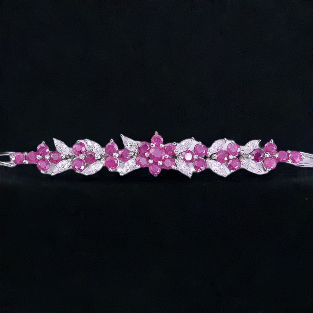The design is elegant! There is a floral motif to the centerpiece of this bracelet. It features real rubies and leaf-shaped synthetic diamonds.