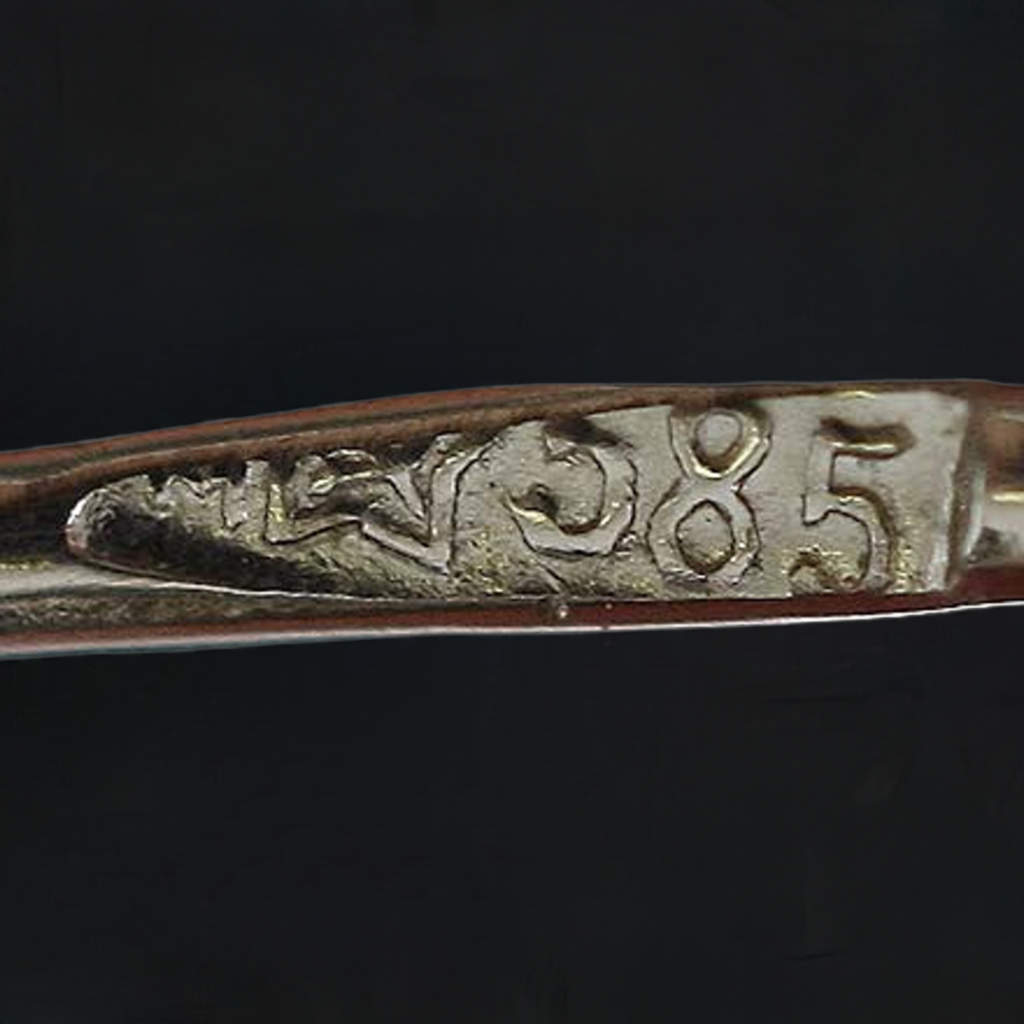 The pin is marked on the reverse with 585 for 14K gold and a star mark. It appears to be the five pointed star with the hammer and sickle inside it used in Russia after the revolution. Only part of the mark is visible so we cannot guarantee it, but the piece is probably Russian. We have tested the pin with nitric acid and guarantee it to be 14K gold.