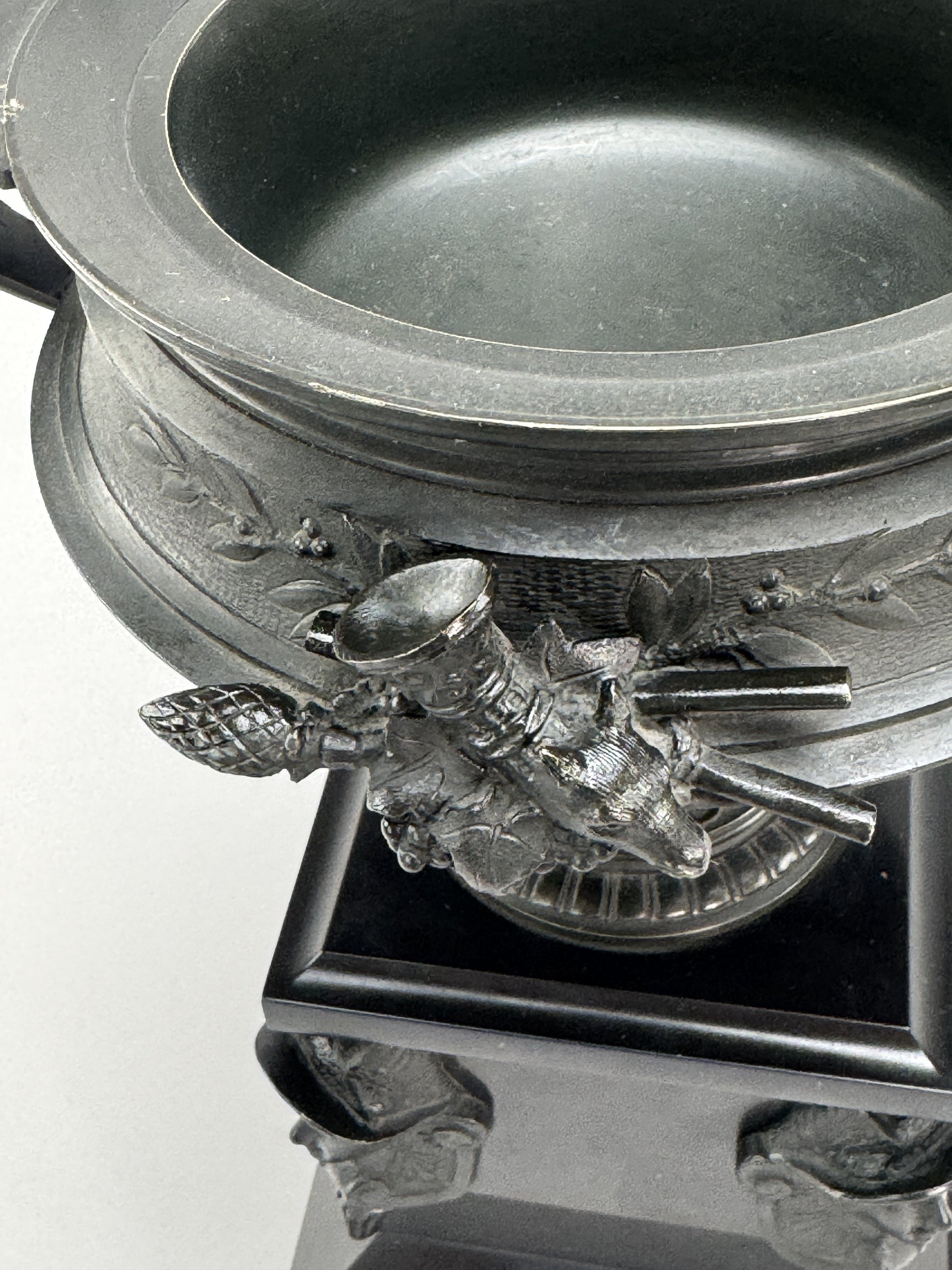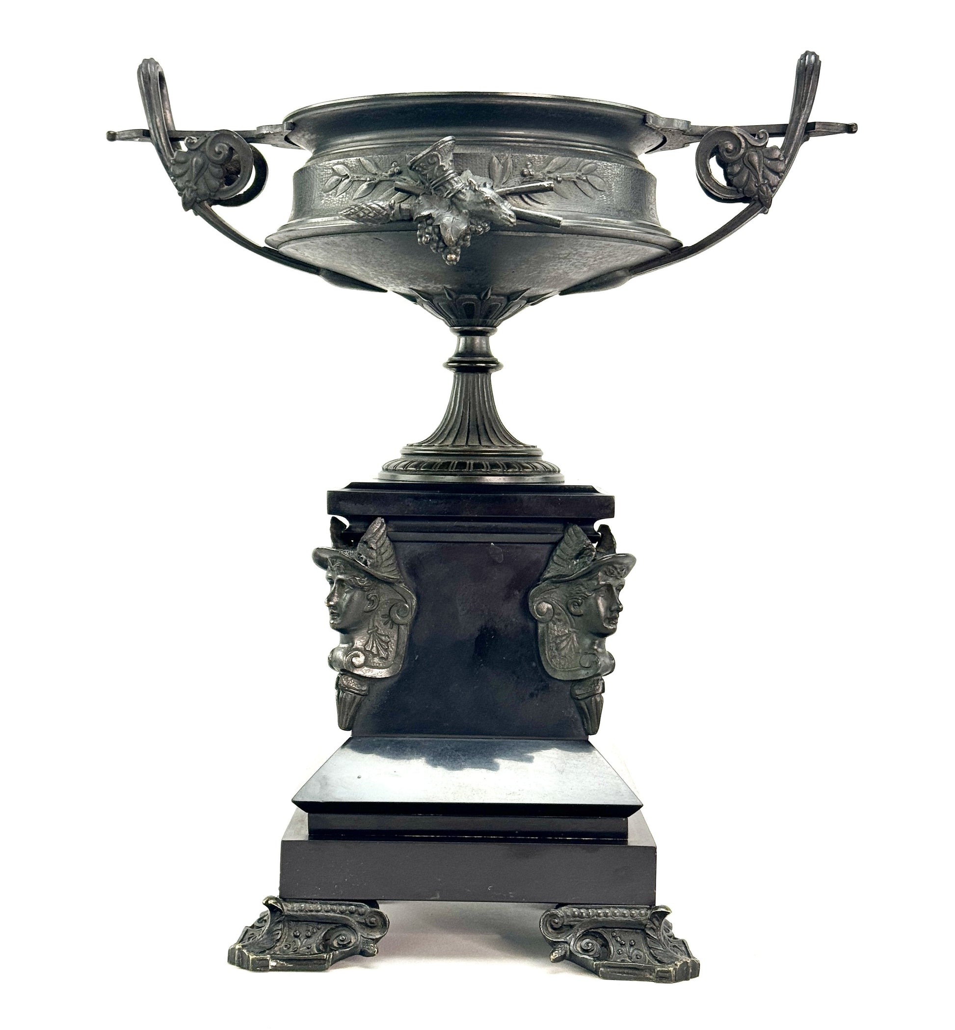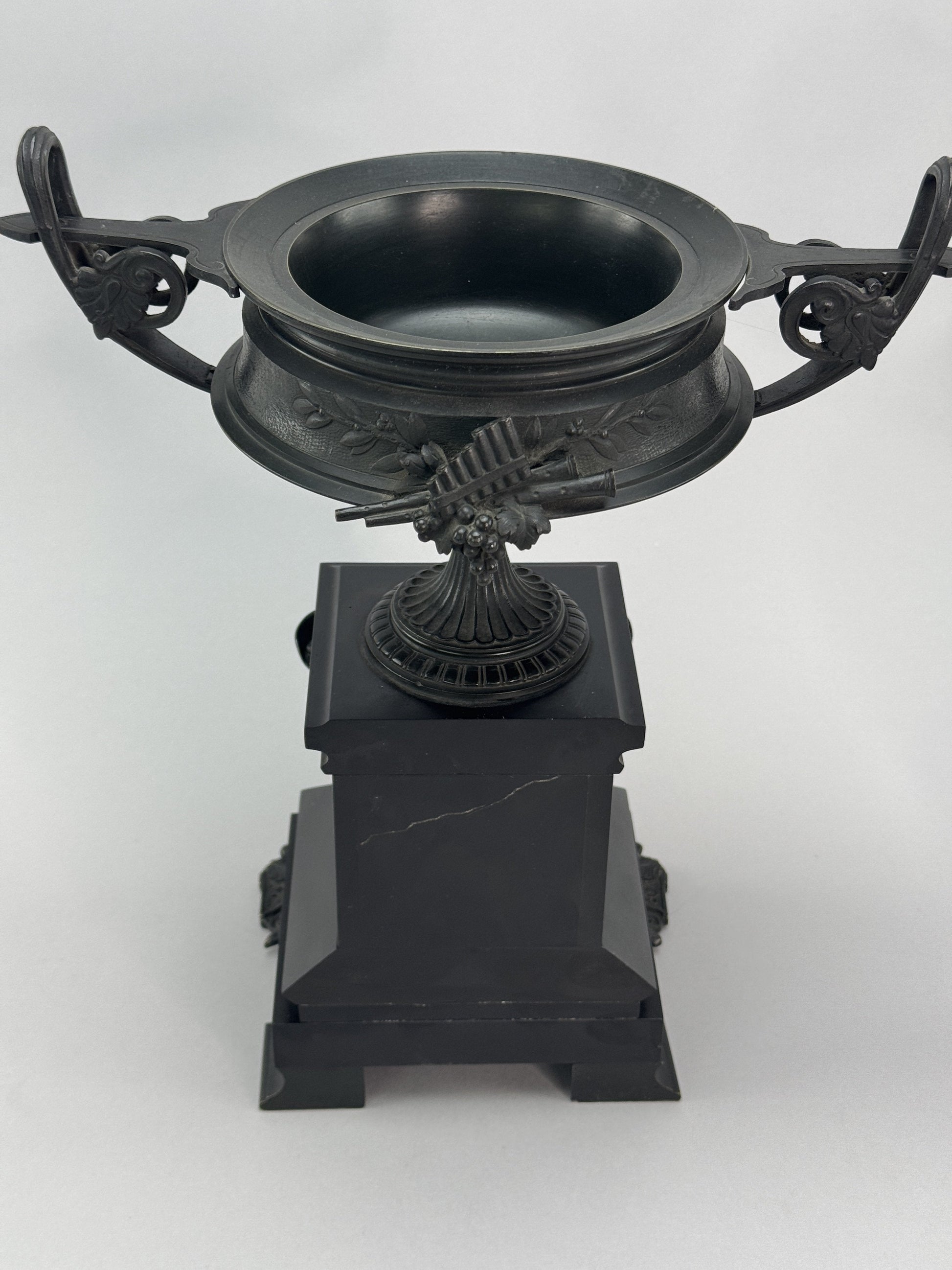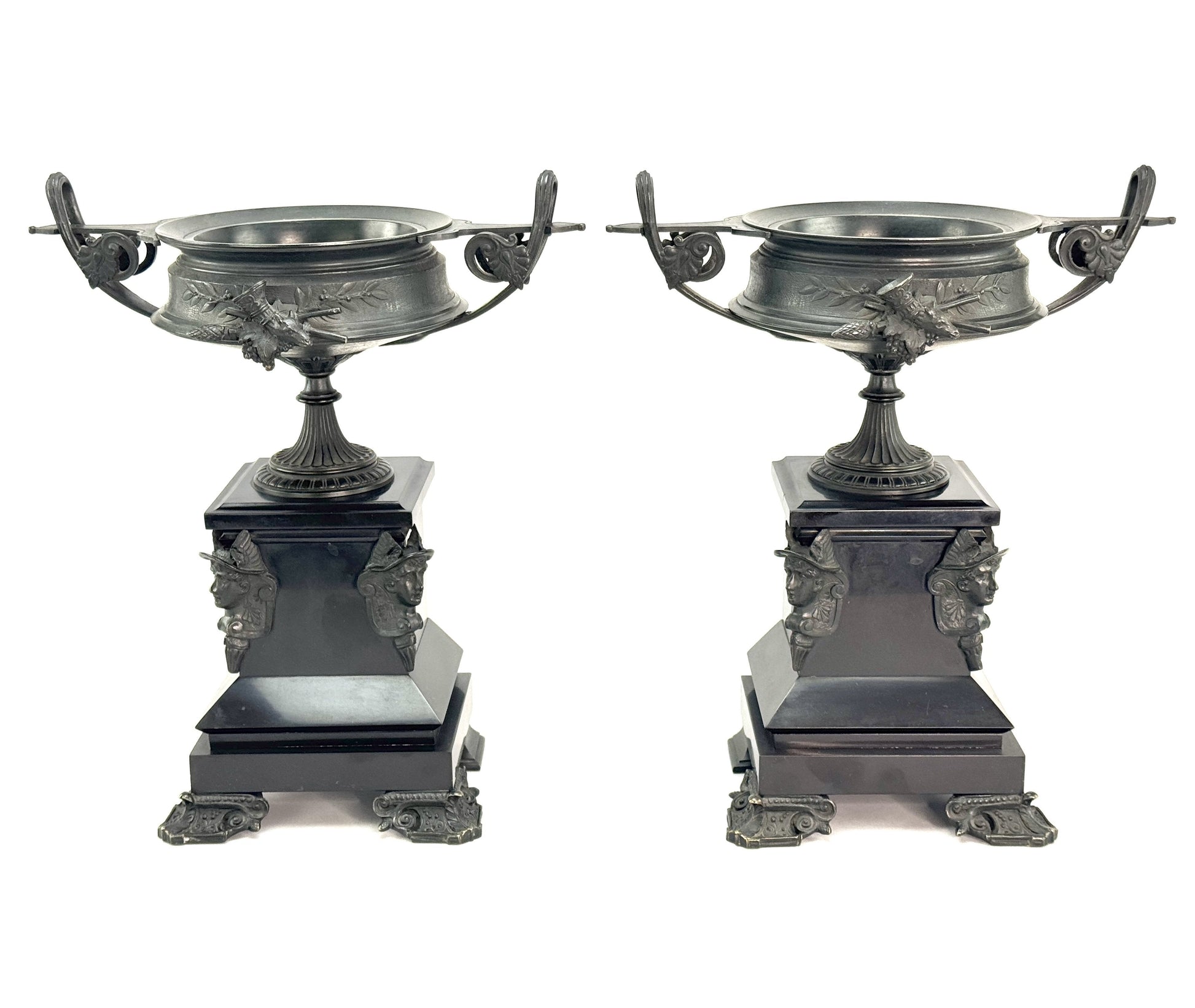 Presented is an exceptional quality pair of antique patinated bronze urns on black stone bases, likely French, dating to around the 1870s. The urns themselves are fabulously cast in classical Grecian kantharos form, with wide set curving handles and a round pedestal foot. The handles have acanthus leaf designs on the sides, and the sides of the basin have clusters of grapes, thyrsus staves and rhyton drinking horns adorning one side, with a cluster of grapes, syrinx pan flute and aulos flute on the other. The surface of the bronze itself has a laurel wreath design against a textured finish. The corners of the stone bases have finely cast Hermes masks complete with winged cap, and even the bronze feet supporting the stone bases are cast in a very ornate and decorative style with foliate and scroll motifs. An incredibly impressive and eye-catching pair of ornaments. Possibly original to a mantle clock garniture set and easy to display in that fashion with a central bronze or clock of your choosing, but entirely worth display on their as a very striking pair.