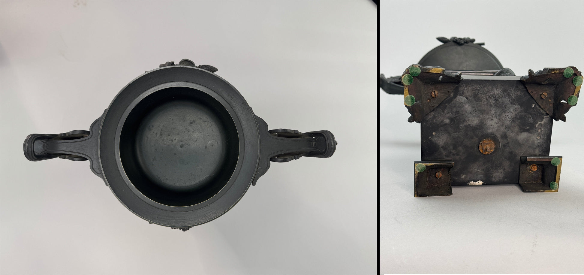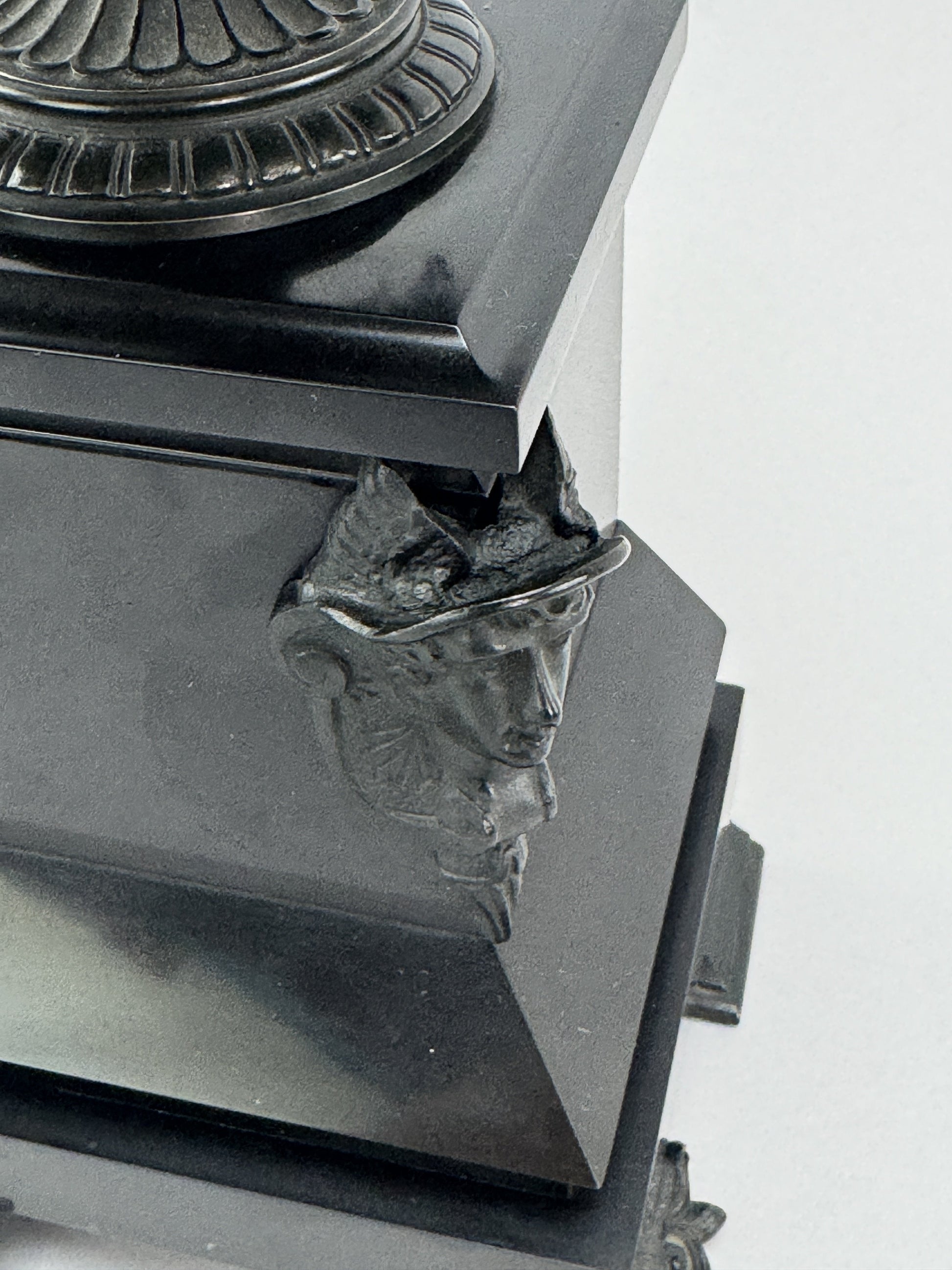 This pair of urns is in excellent condition. The patina of the bronze is in great shape. The stone bases have no chips or cracks, but one does have an abrasion to the back side, visible in the eighth photo. The bronze has no breaks or repairs.