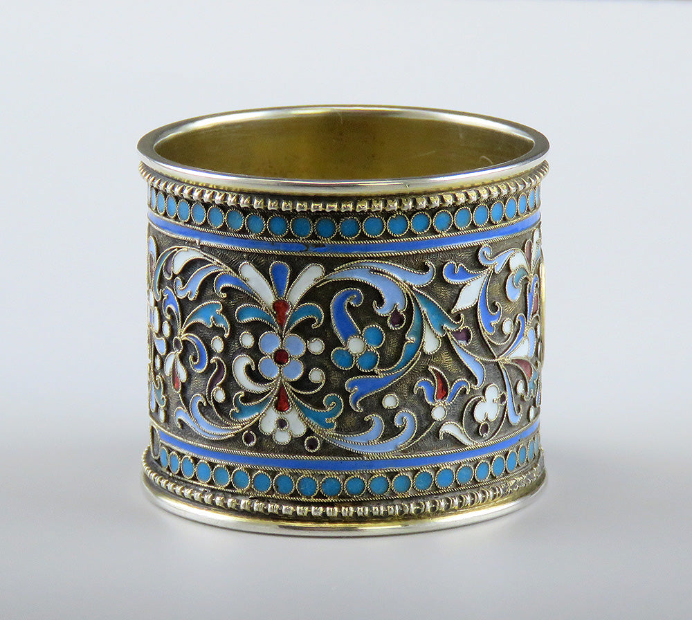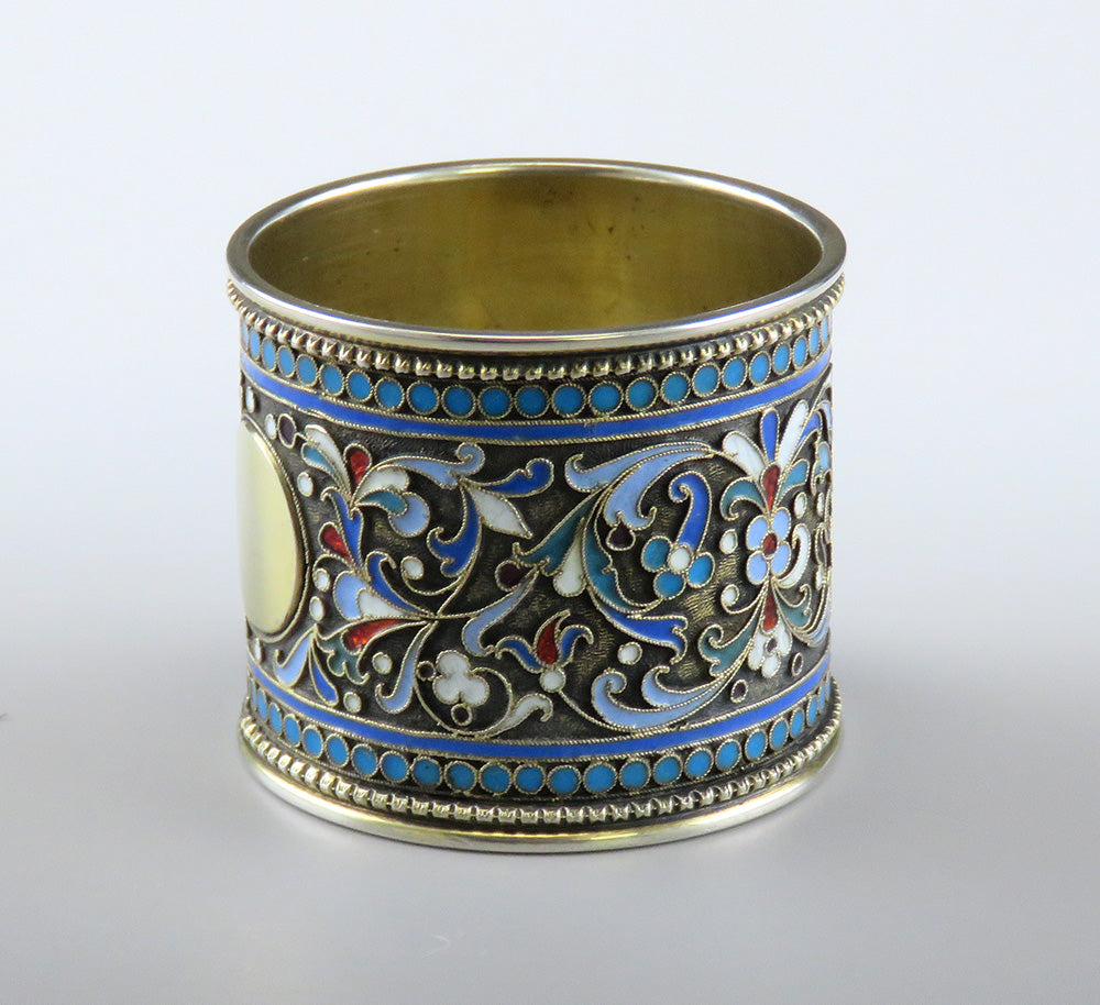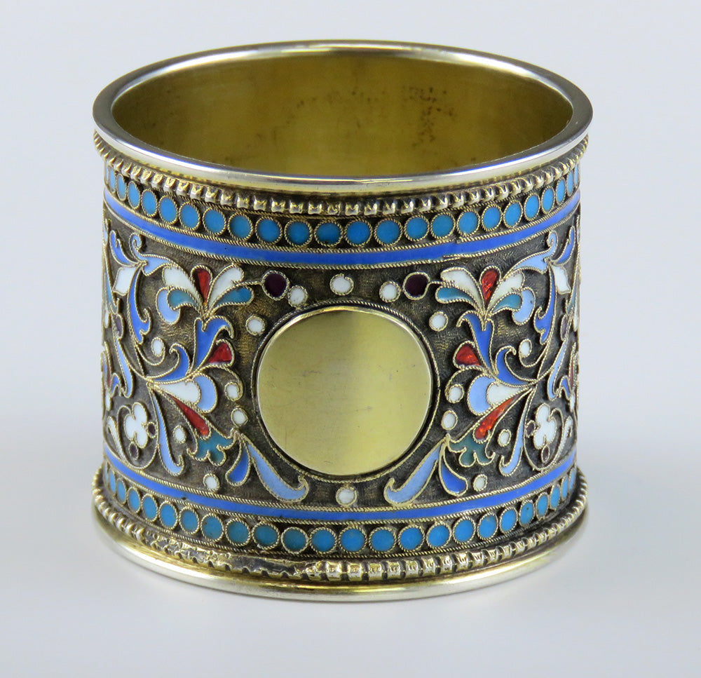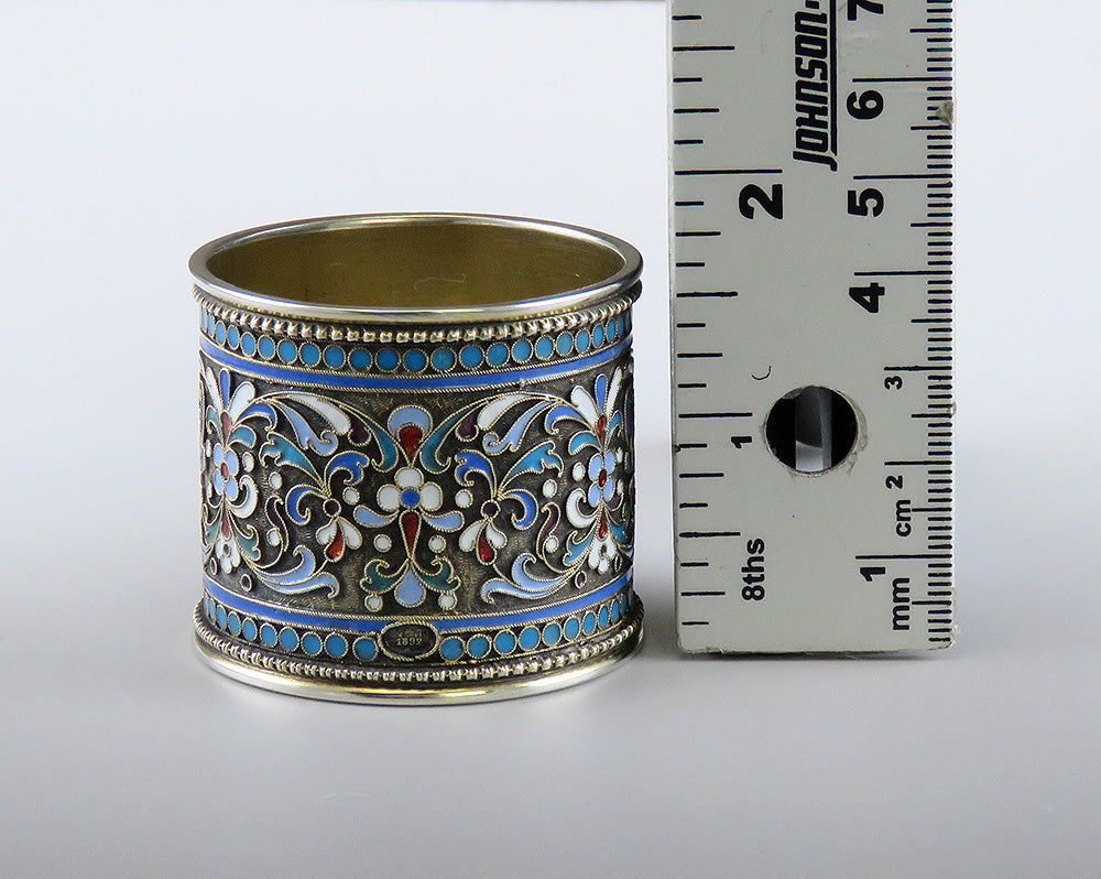 Ornate Antique 1892 Russian Gilded Silver Cloisonné Enamel Napkin Ring