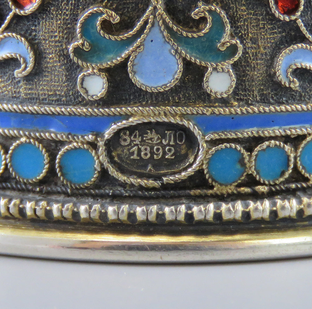 The outside bears the Russian 84 mark for 84/96 or .875 purity silver and also has a date of 1892 as well as a maker's initials.