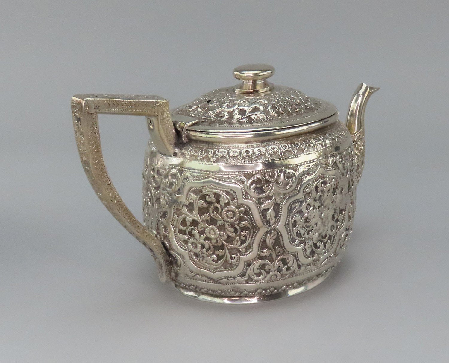 Presented is an ornate southeast Asian teapot from the late 1800s to early 1900s. This piece is elaborately decorated with hand chased and engraved floral and foliate scrollwork, against a stippled and oxidized background so the details of the intricate designs really pop. The decoration is extensive, covering just about the entirety of the surface of the pot. The teapot has a high angular handle and graceful S-curved spout.