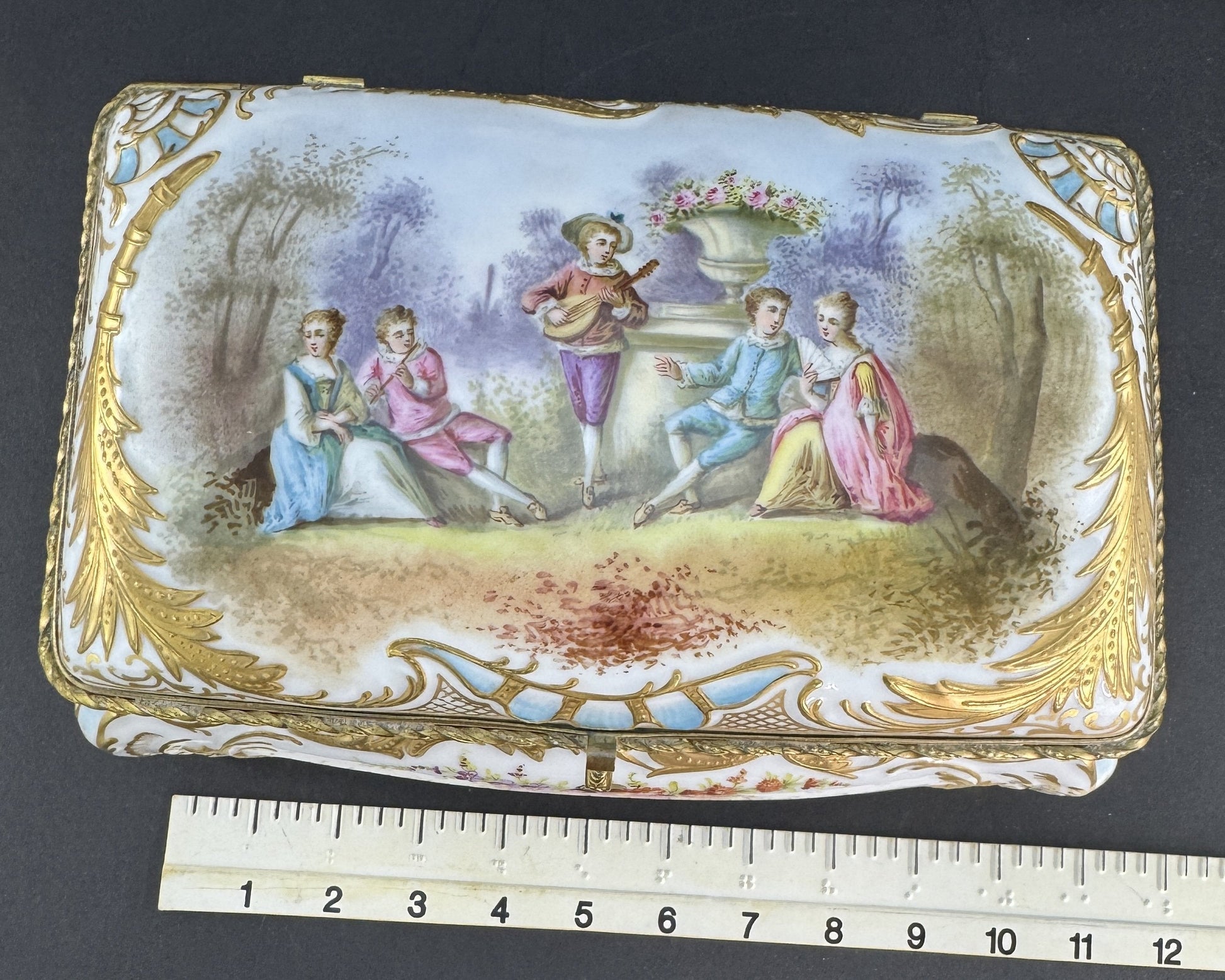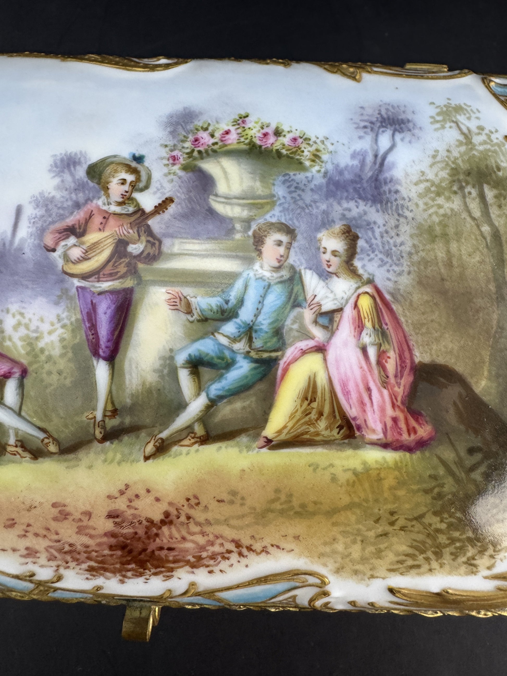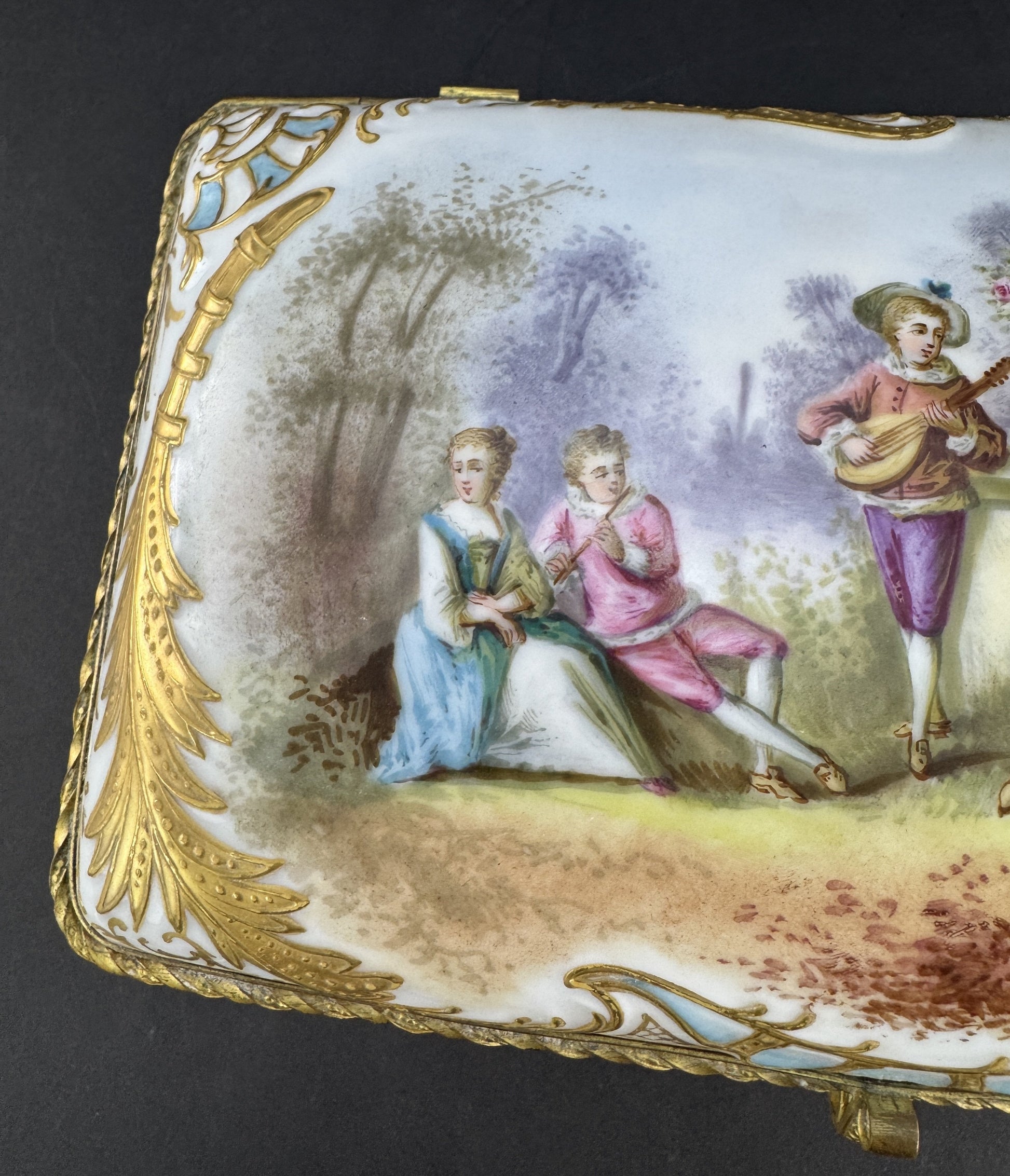 Presented is a fabulous quality antique porcelain jewelry or large dresser box. This piece dates to the late 1800s or early 1900s and is of continental European make. The box is very ornately decorated, featuring a hand painted scene of a musician playing for two courting couples in an outdoor setting, very colorful and detailed. Surrounding the scene are foliate and shell or wave designs with rich gold gilt detailing. The end sides have marble-esque reserves bordered in light blue, and the back side is intricately gilt with foliate scrollwork, floral sprays, and latticework panels surrounding a central acanthus leaf or palmette. The front has a colorful floral bouquet design, as does the interior of the lid and of the box itself, again all hand painted. The box has gilt brass mounts and stands on four feet. The design of the lid is particularly nice, with a mechanism built into the hinges to stop the lid from over-opening and possibly being damaged.