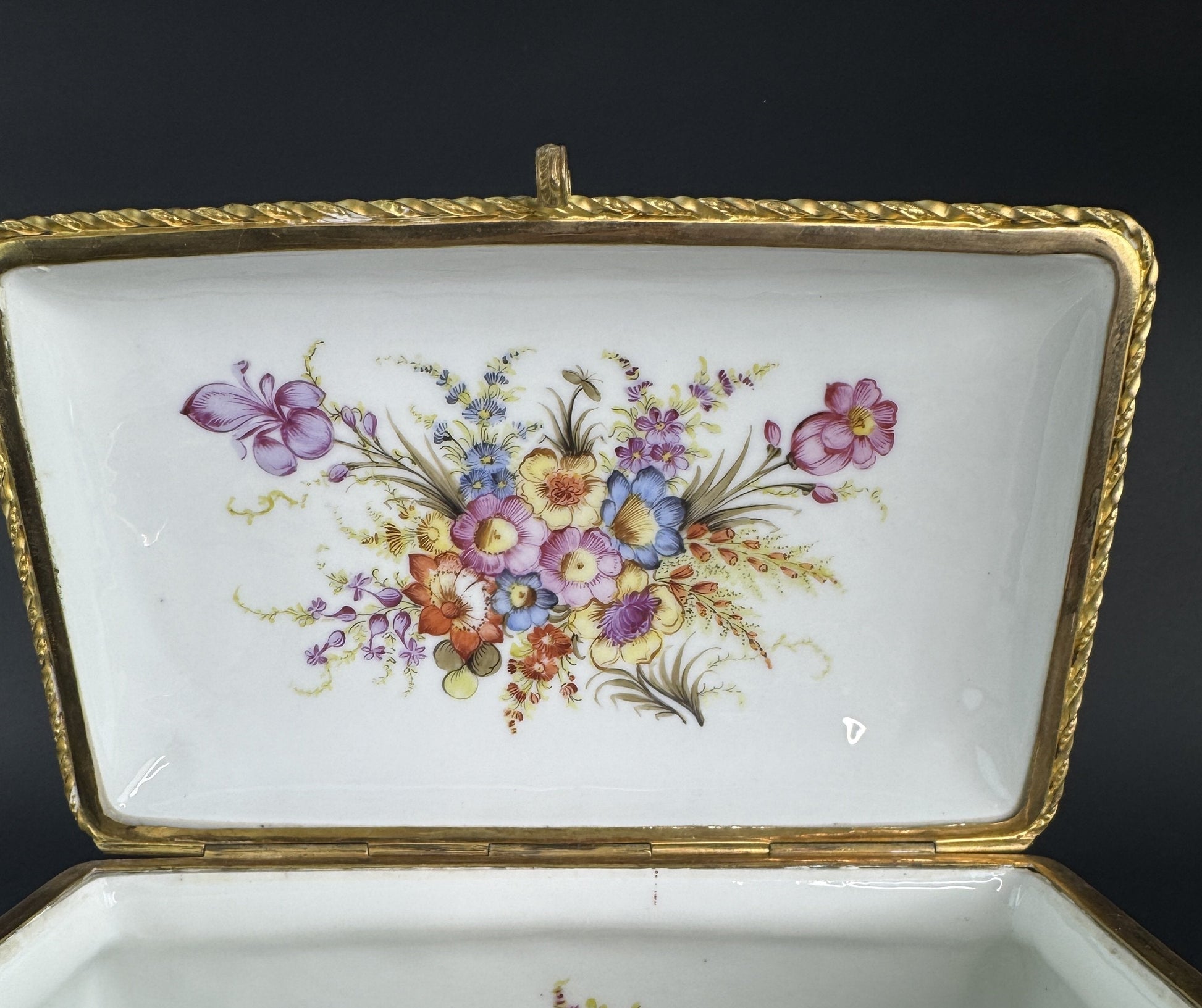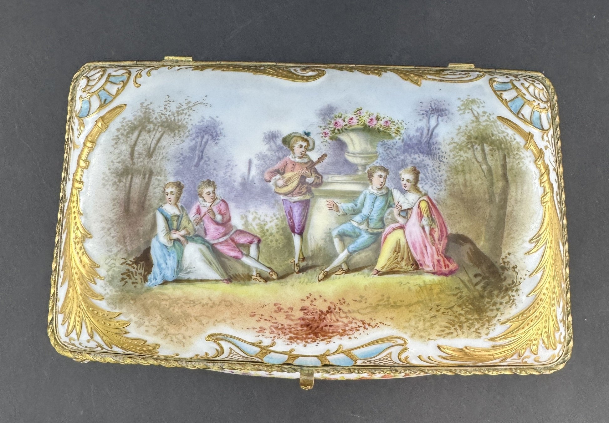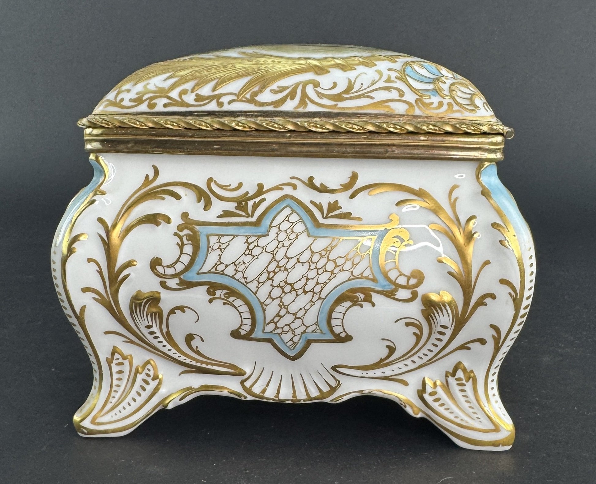 Presented is a fabulous quality antique porcelain jewelry or large dresser box. This piece dates to the late 1800s or early 1900s and is of continental European make. The box is very ornately decorated, featuring a hand painted scene of a musician playing for two courting couples in an outdoor setting, very colorful and detailed. Surrounding the scene are foliate and shell or wave designs with rich gold gilt detailing. The end sides have marble-esque reserves bordered in light blue, and the back side is intricately gilt with foliate scrollwork, floral sprays, and latticework panels surrounding a central acanthus leaf or palmette. The front has a colorful floral bouquet design, as does the interior of the lid and of the box itself, again all hand painted. The box has gilt brass mounts and stands on four feet. The design of the lid is particularly nice, with a mechanism built into the hinges to stop the lid from over-opening and possibly being damaged.