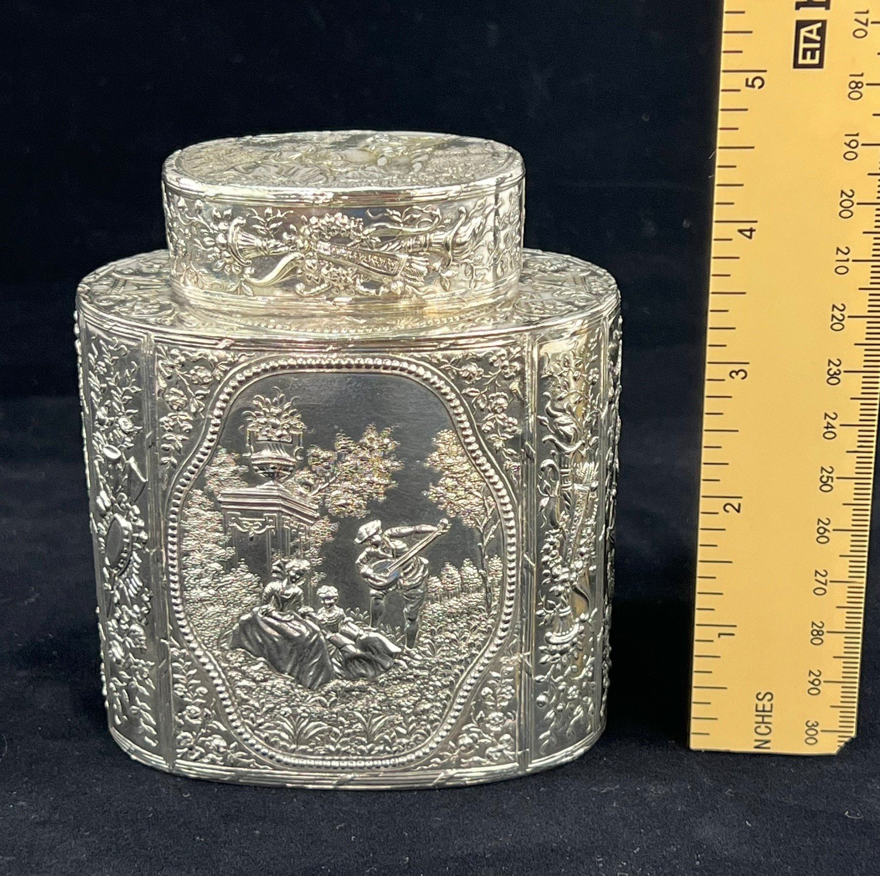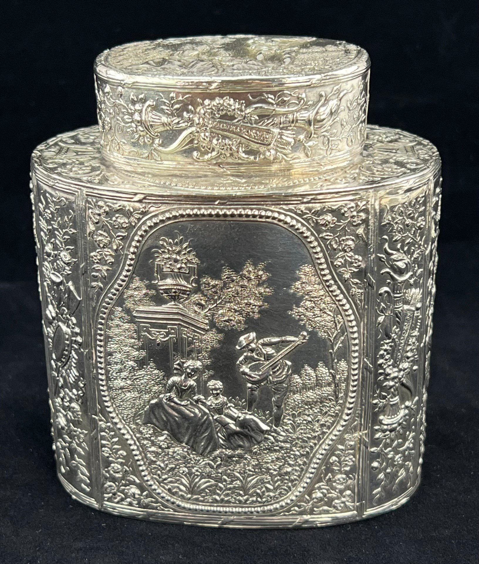 Presented is a fabulous quality Hanau German silver tea caddy, dating to the late 1800s or early 1900s. The tea caddy is very well made and quite ornate, beautifully hand chased with floral and foliate decoration surrounding richly detailed genre scenes. The larger sides have a scene of two women in a garden listening to a man play a lute, which is repeated on the top of the lid. The shorter sides show a finely dressed lady, between panels depicting various musical instruments, bows and arrows, and cornucopiae. The quality of the decoration is exceptional, all very crisp and richly detailed, and the caddy is a good large size as well.