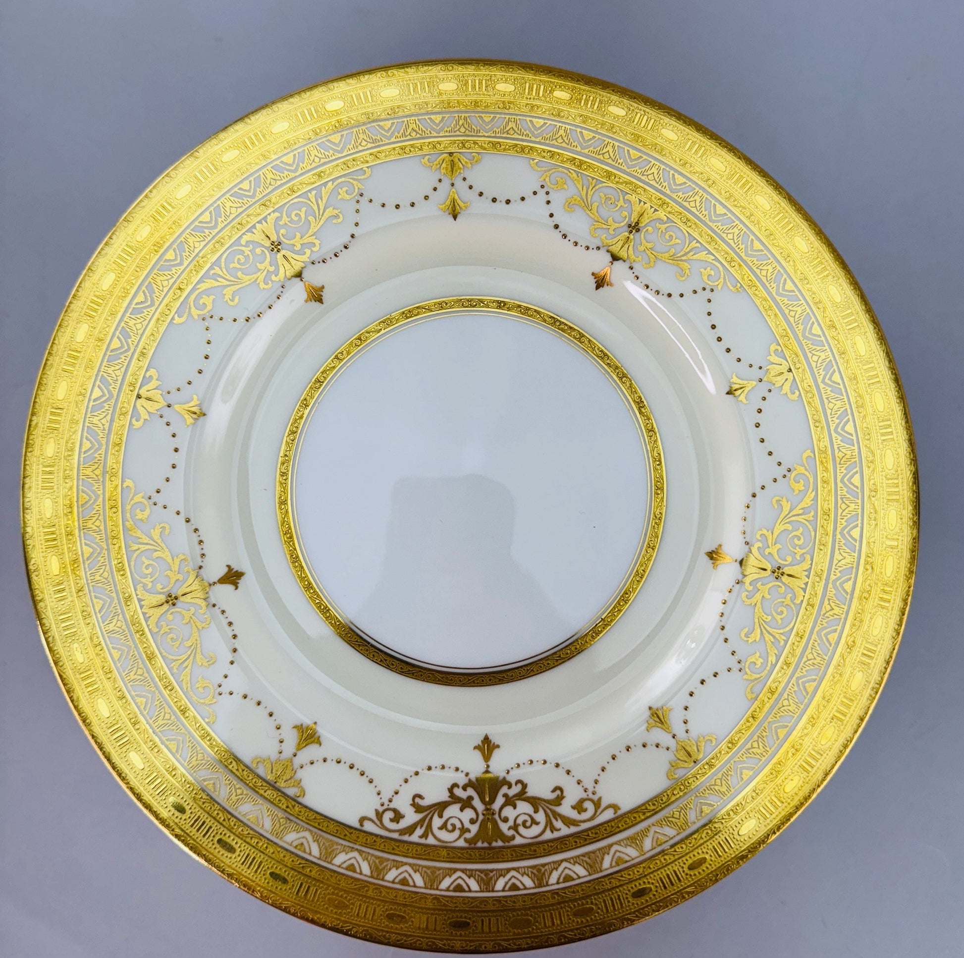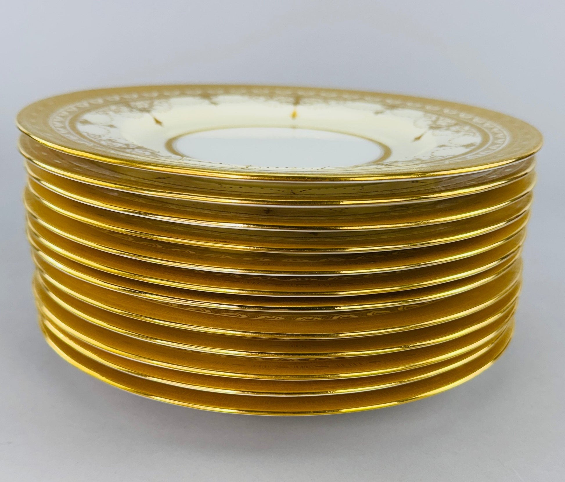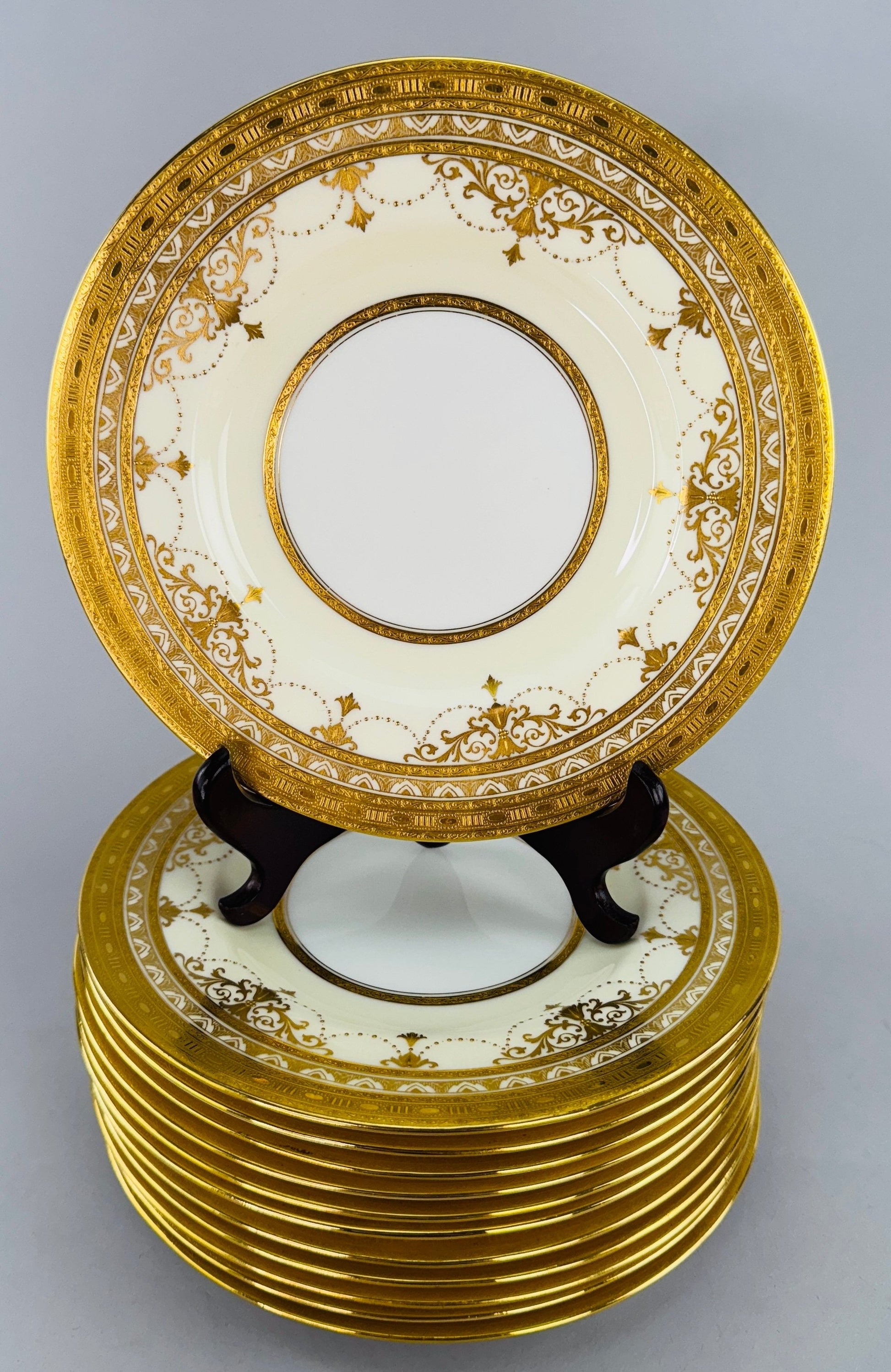Ornate Set 12 Antique Minton Gold Gilt Cream White 9" Luncheon Salad Plates