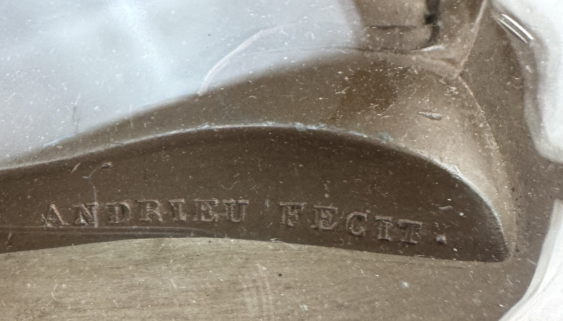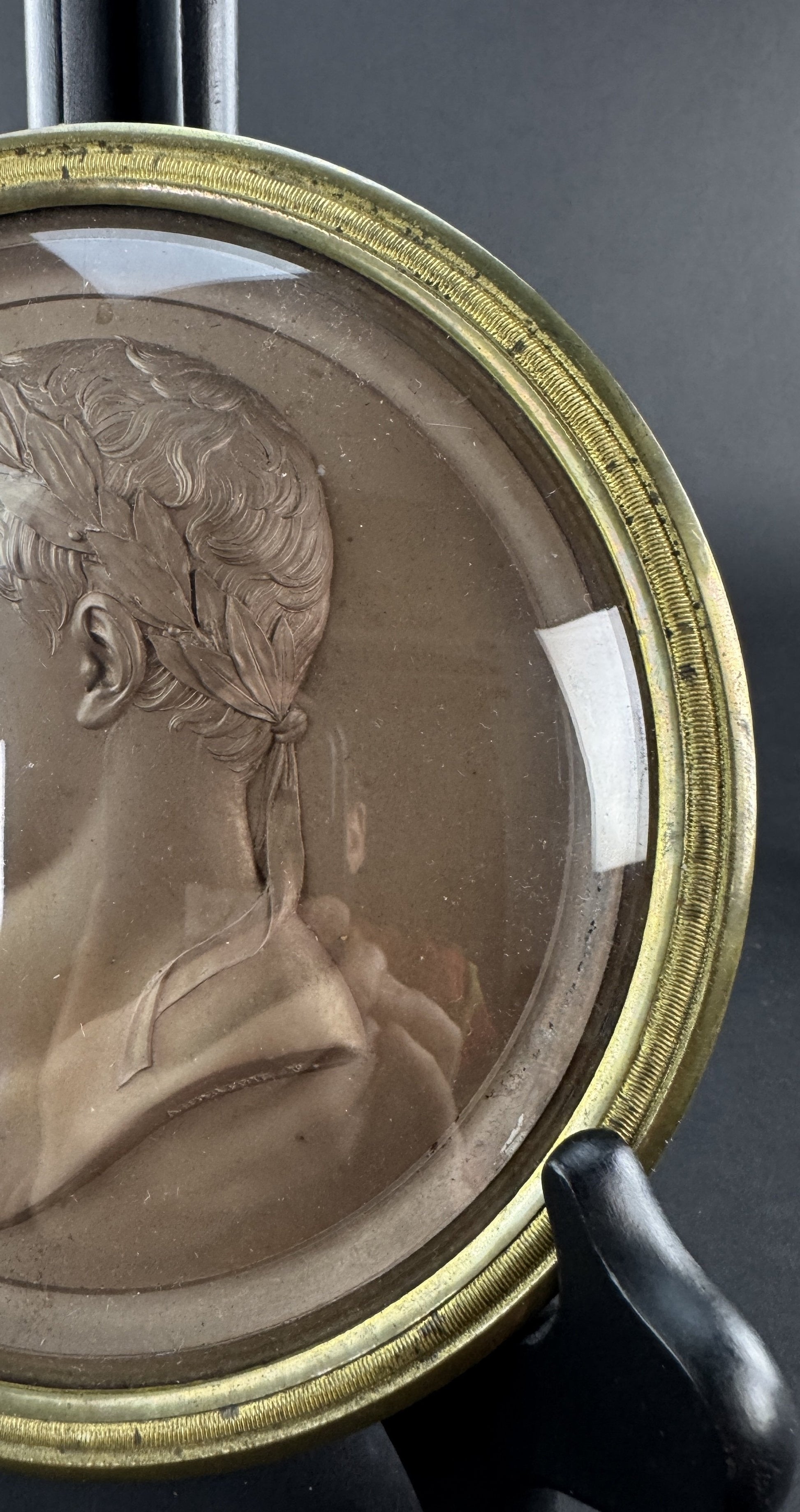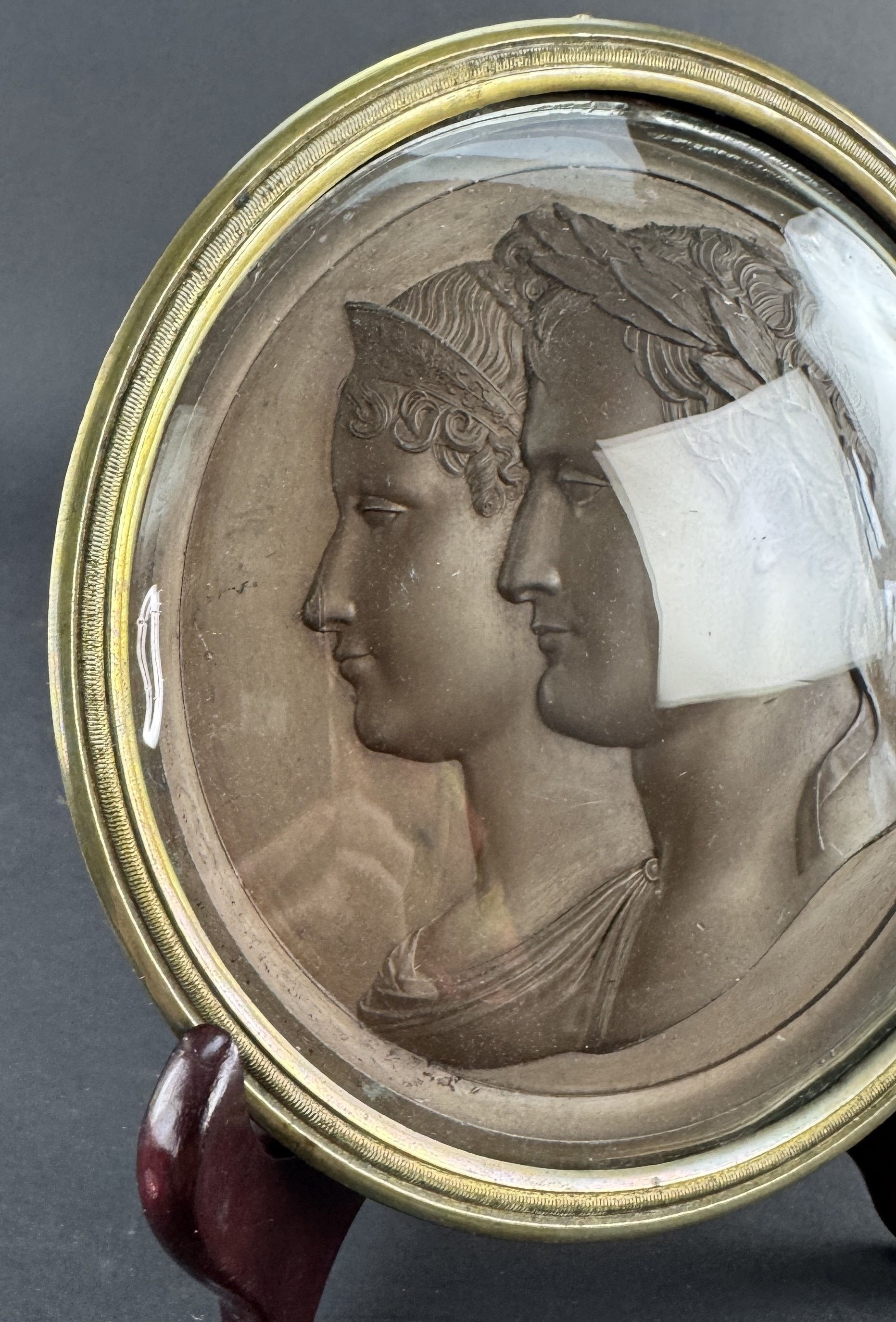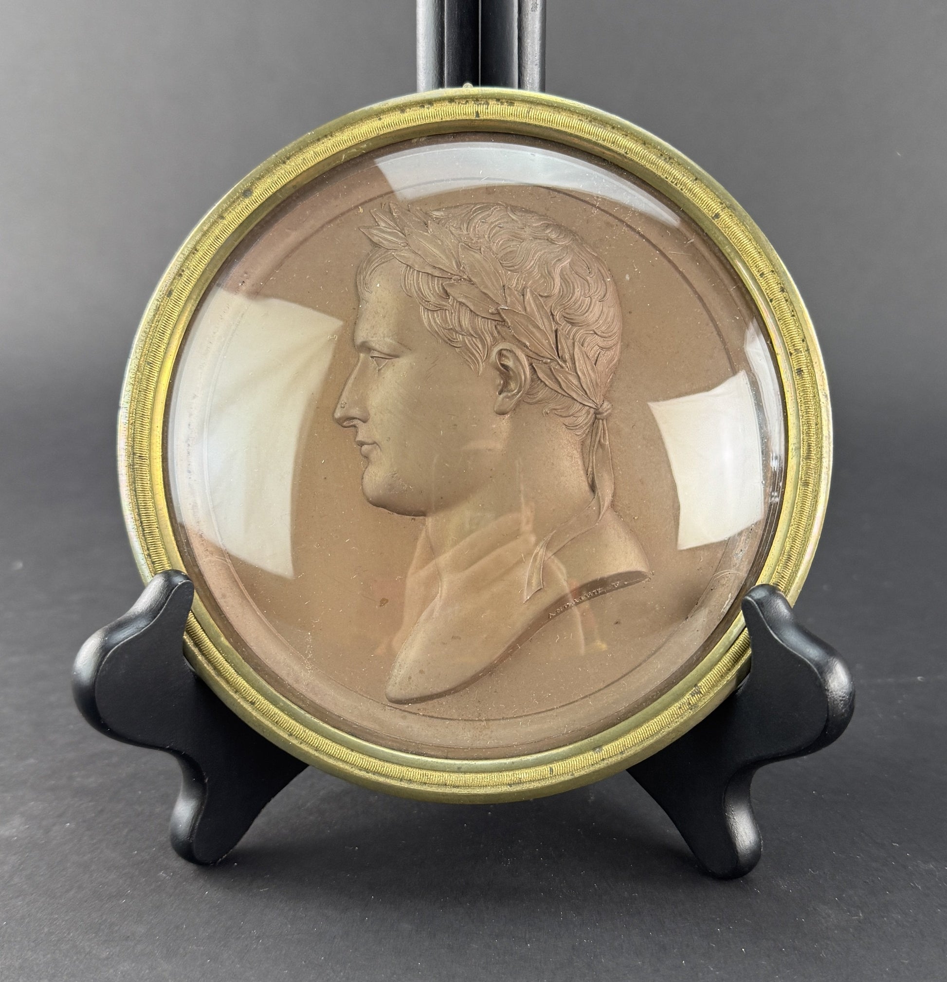 Presented is a stately pair of antique French bronze patinated lead bas relief medallions, by Jean Bertrand Andrieu (1761-1822). One medallion features the bust of Napoleon in profile in classical Roman-inspired style, while the other depicts both Napoleon and either Marie Louise or Josephine, but likely Marie Louise. The medals are set in elegant gilt brass frames, with glass fronts and loops for hanging. The medal with Napoleon and Marie Louise is signed for Jean Bertrand Andrieu, “fecit.” The Napoleon medal is likewise signed Andrieu, “F” (fecit).
