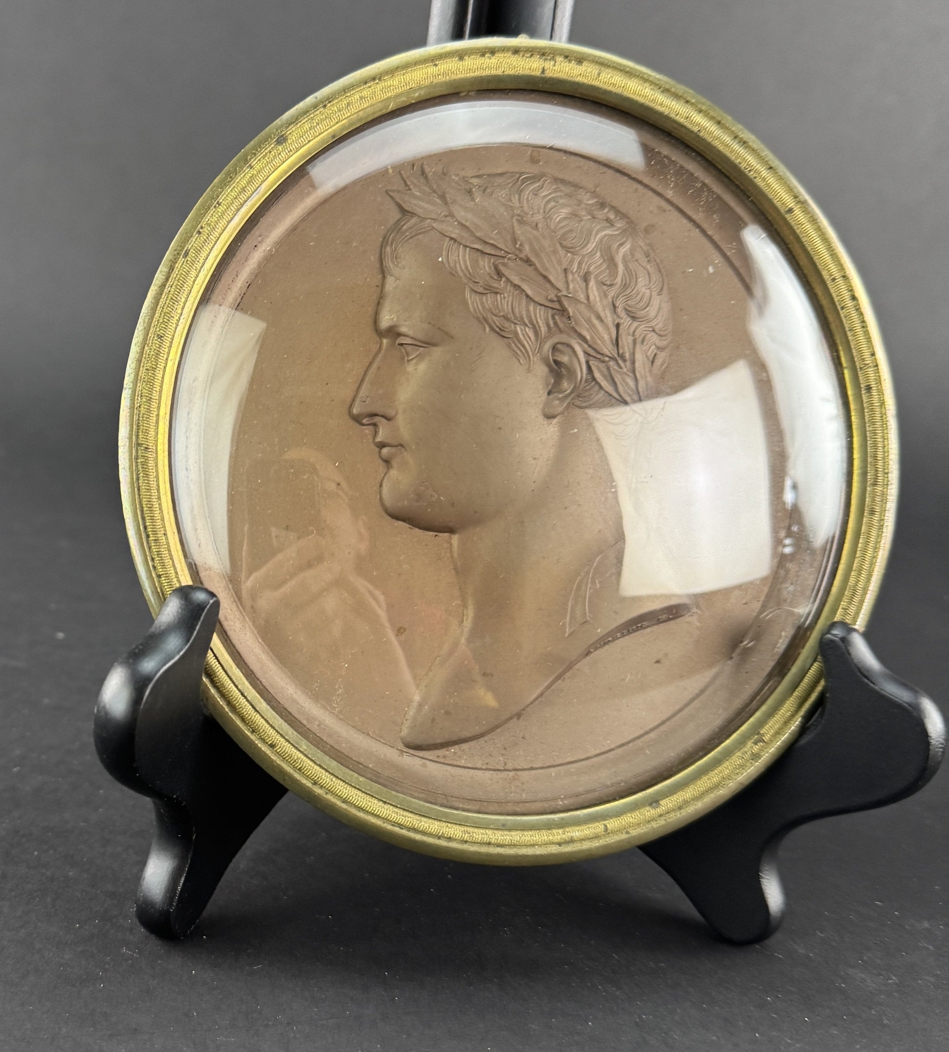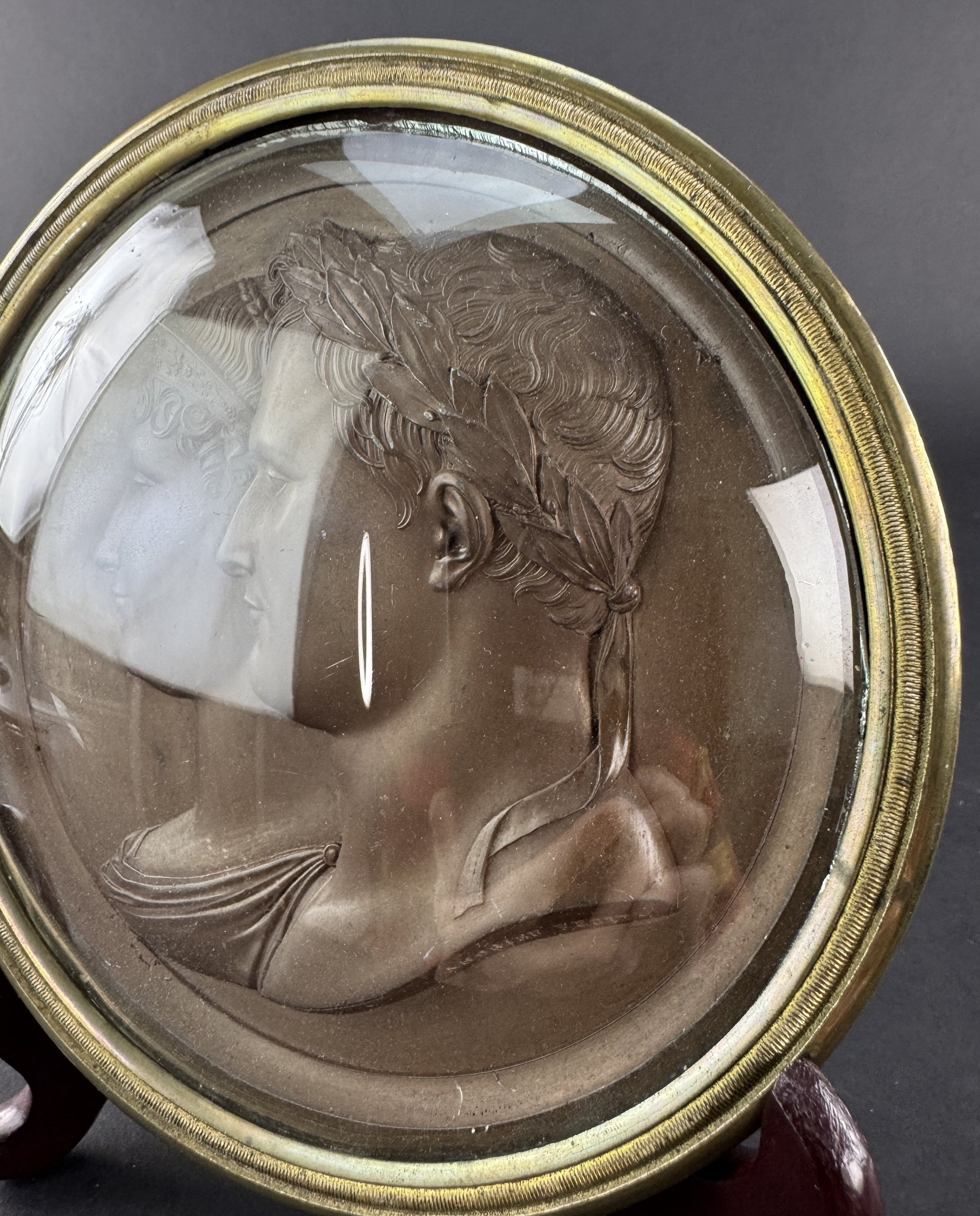 This pair of medals is in excellent overall condition. The medal featuring only Napoleon has some wear to the bronze on the edge, at about the 3-5o'clock position, but this is not very noticeable as it is to the edge only. The one featuring Napoleon and Marie Louise has a tiny chip to the glass at about the 12 o'clock position. The material on the back is in good shape, and has possibly been re-done. The glass is undoubtedly original. There are no other chips or damages.